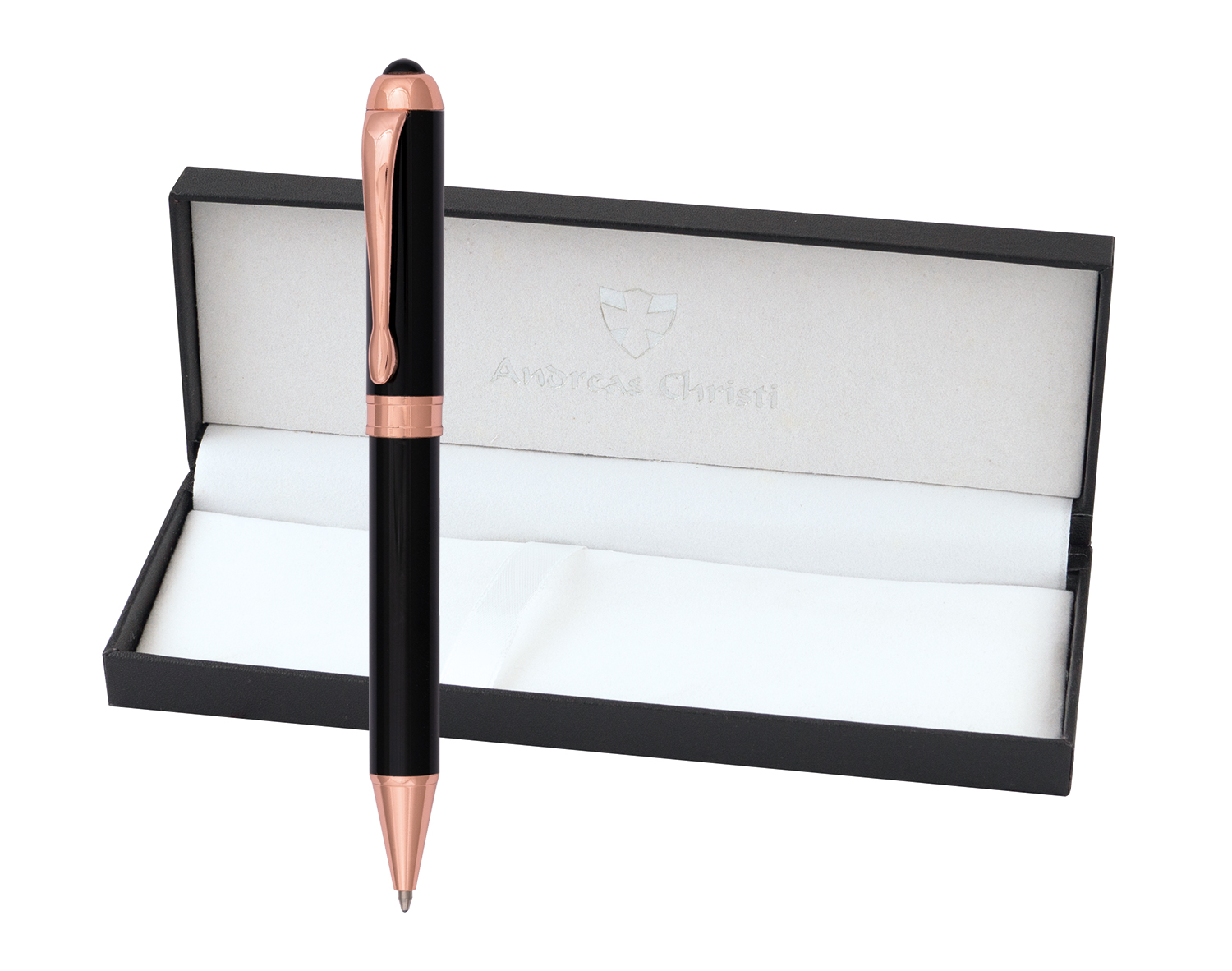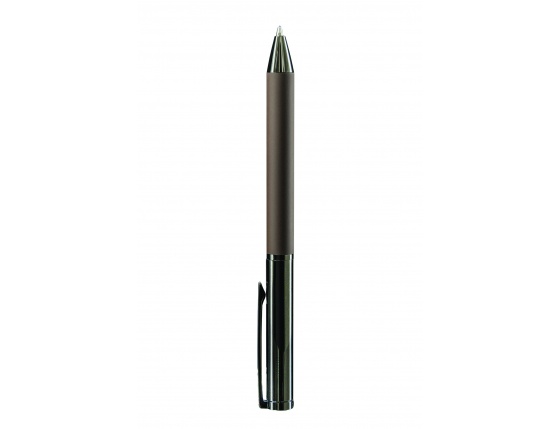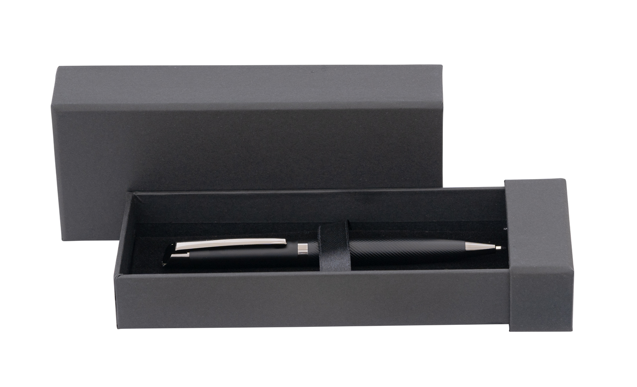 Стилна метална химикалка "ALEXANDER", с въртящ механизъм. В черен цвят със златни елементи. В луксозна кутия "ALEXANDER".