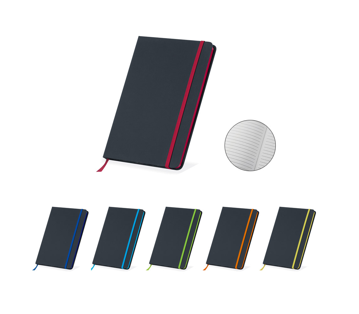 Тефтер A5 с ластик и разделител, 80 листа с редове, цвят на хартията слонова кост с цветен ръб, твърда корица. Материал: PU, хартия. Размер на артикула: 148х210x13 mm. Печатаемо поле: 60х60 mm. Печат: тампонен, ситопечат, гравиране, сухо преге.