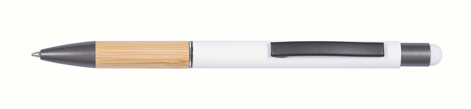 Метална химикалка със стилус за тъчскрийн, бамбуково захващане, металик елементи и меко гумирано покритие.