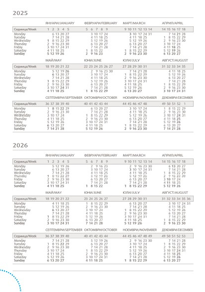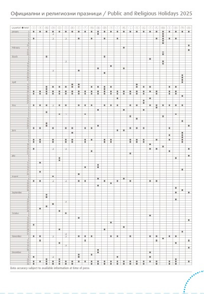 С дати. Мултинационално тяло, осем езика вкл. български, заглавна страница, официални и църковни празници в България и 24 страни. Хартия бял офсет. Текстилна лента за отбелязване. Перфорация на ъглите.