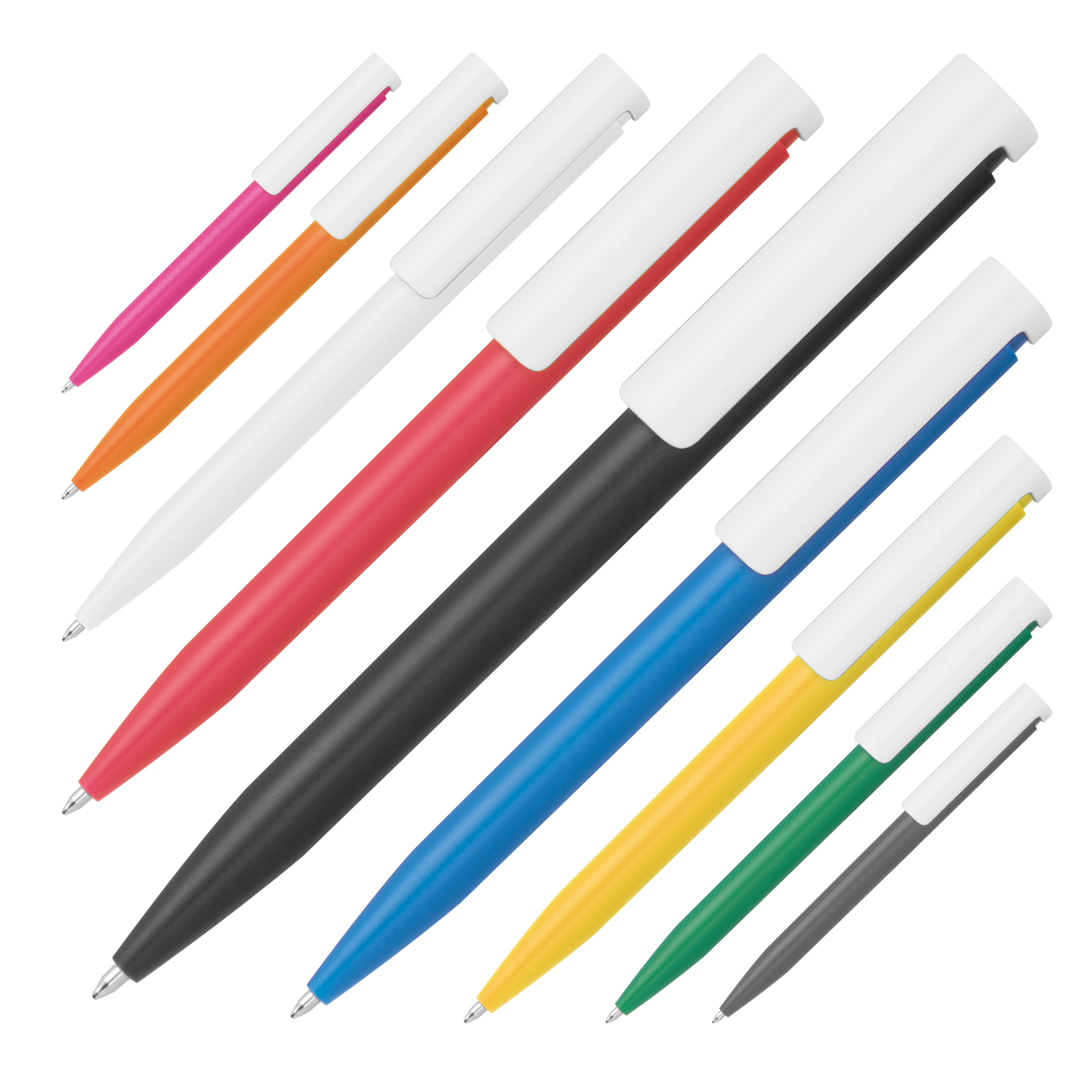 Пластмасова химикалка с щракащ механизъм, син пълнител за писане и широк бял клипс, подходящ за брандиране.