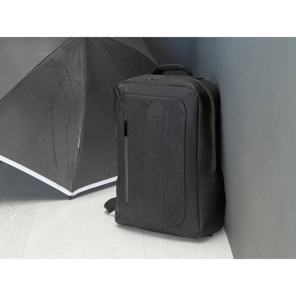 Водоустойчива раница за лаптоп от 600D полиестер с водоустойчиви ципове. Подплатено основно отделение за лаптоп до 15.6''. Има страничен джоб и преден джоб. Подплатен гръб и презрамки, с подплатена система за поддръжка на гърба.