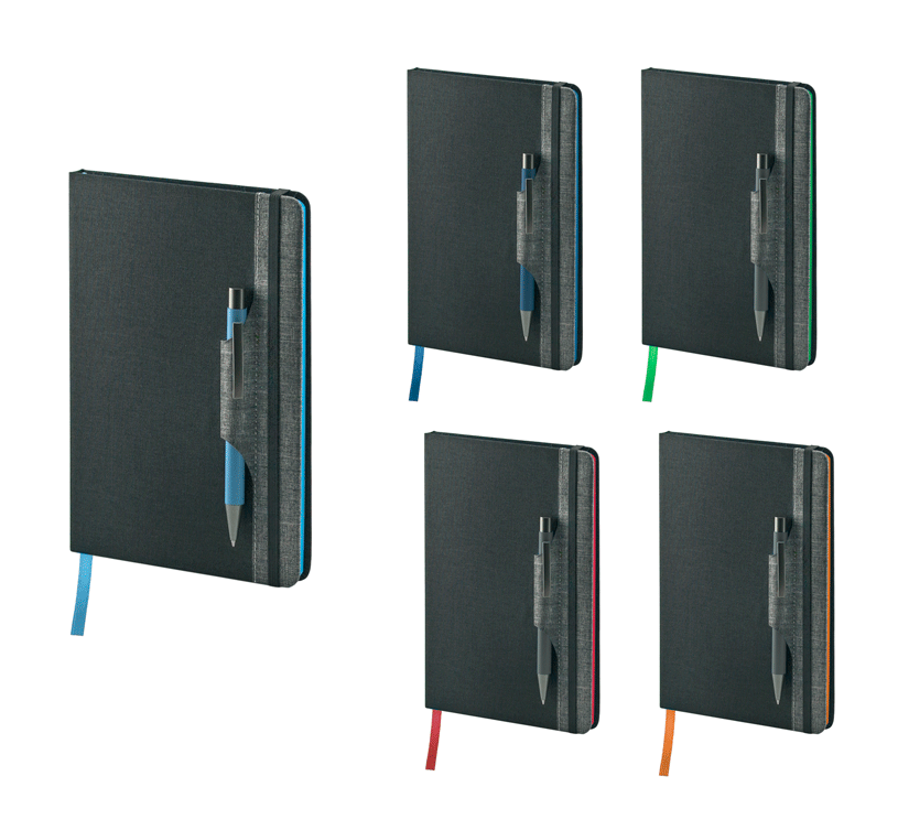 Тефтер A5 с ластик и разделител, 80 листа с редове, цвят на хартията слонова кост с цветен ръб, твърда корица. Материал: PU, хартия. Размер на артикула: 146х210х12 mm. Печатаемо поле: 70х30 mm. Печат: тампонен, ситопечат. (В цената не е включена химикалката! Артикулен номер на химикалката MP-7156)