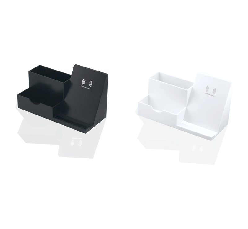 Мултифункционална поставка за бюро с безжично зарядно, стойка за телефон, място за химикалки и визитки.