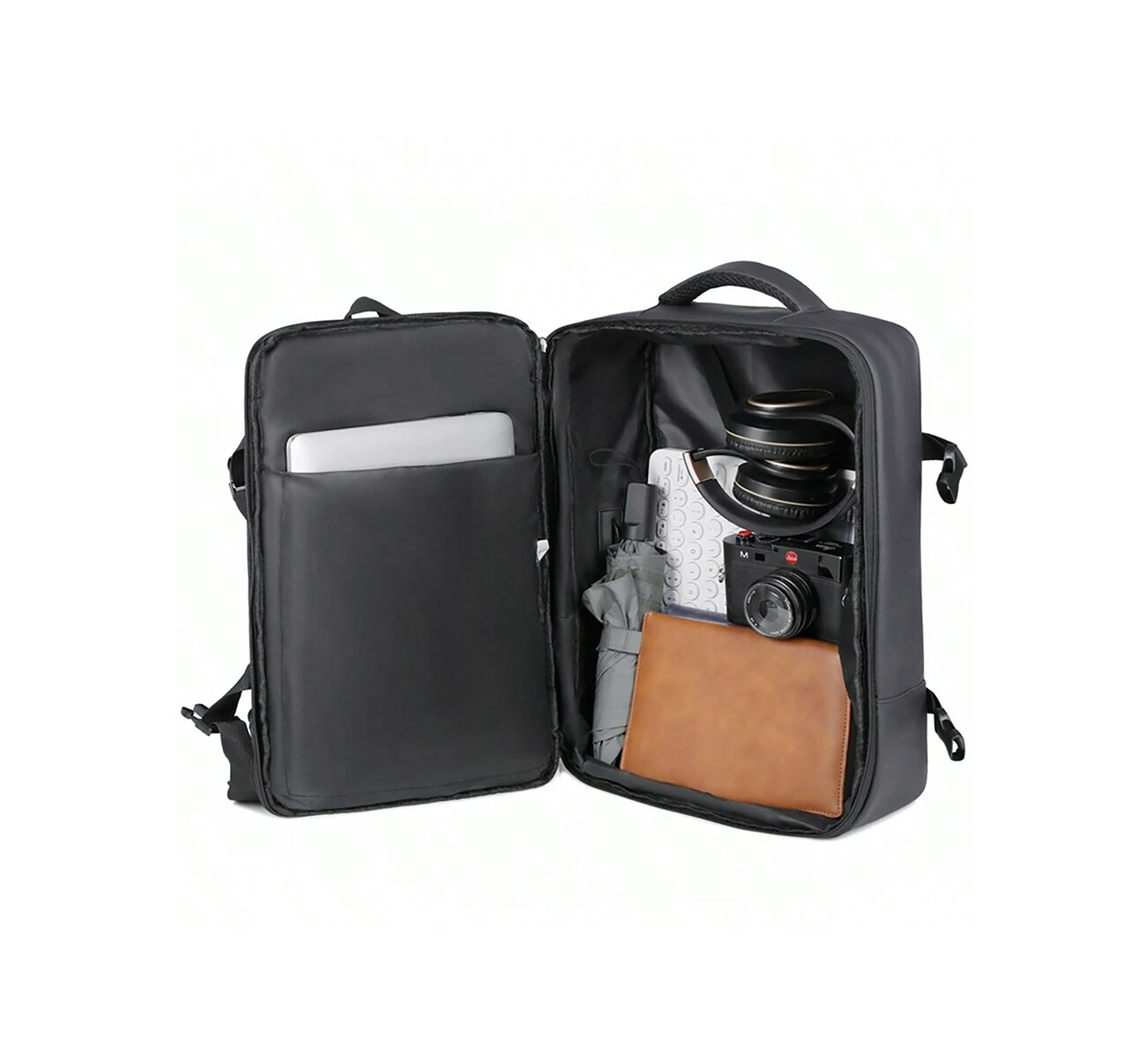 вътрешен и външен джоб, каишка за багаж, пълно отваряне на 180 градуса, технология за зареждане на вашия телефон.