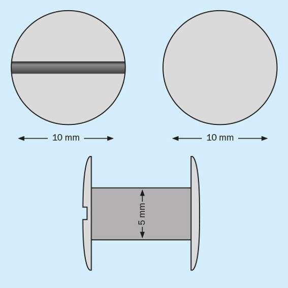 Метални болтове за полиграфията с фиксиран капацитет. Глава 10 мм, диаметър на тубата 5 мм. Капацитет от 3 мм