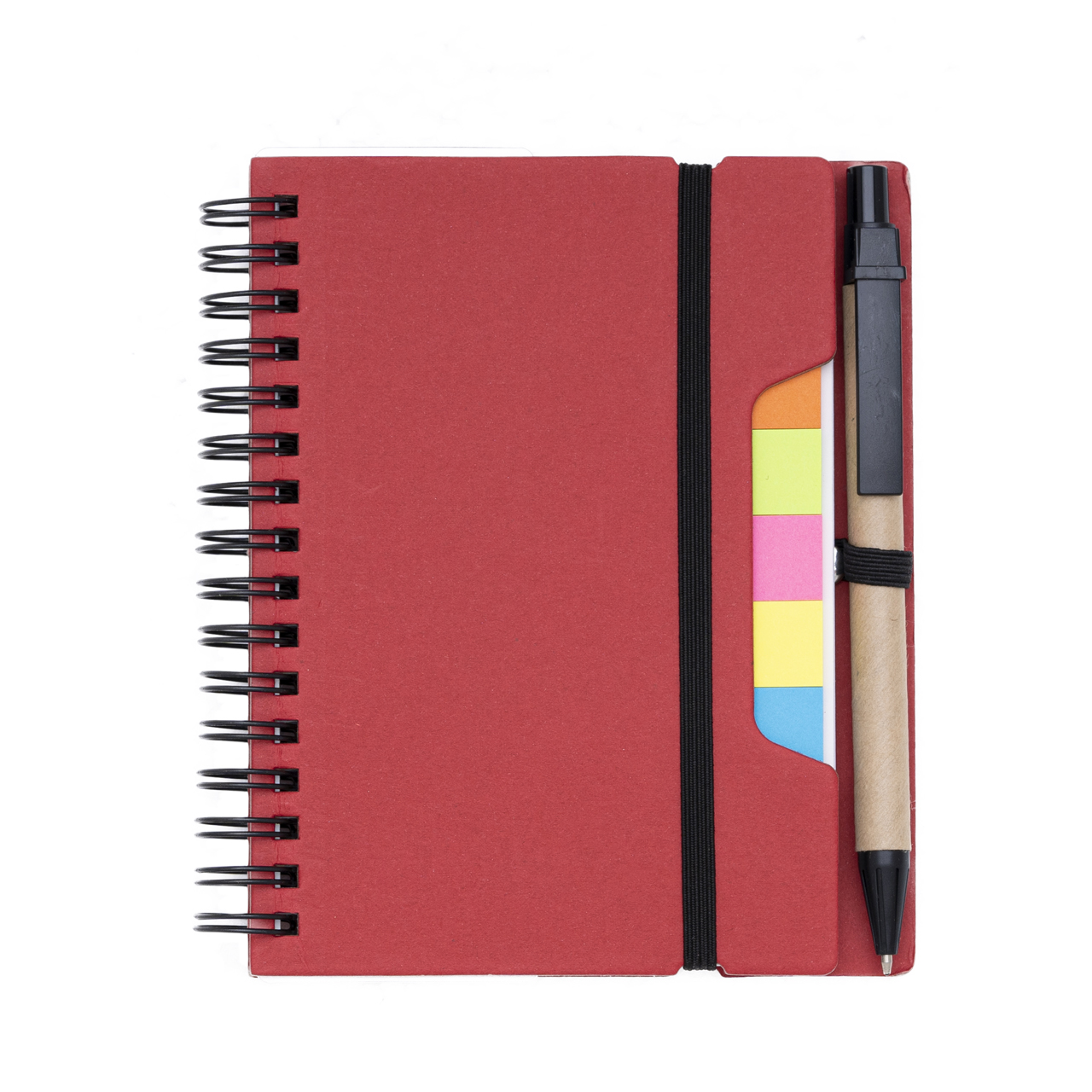 Еко бележник с твърди корици от рециклирана хартия с линийка, цветни самозалепващи се индекси и еко химикалка. Съдържа 140 бели страници на редове 80g/m2.