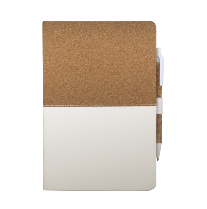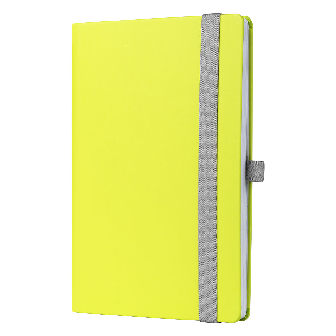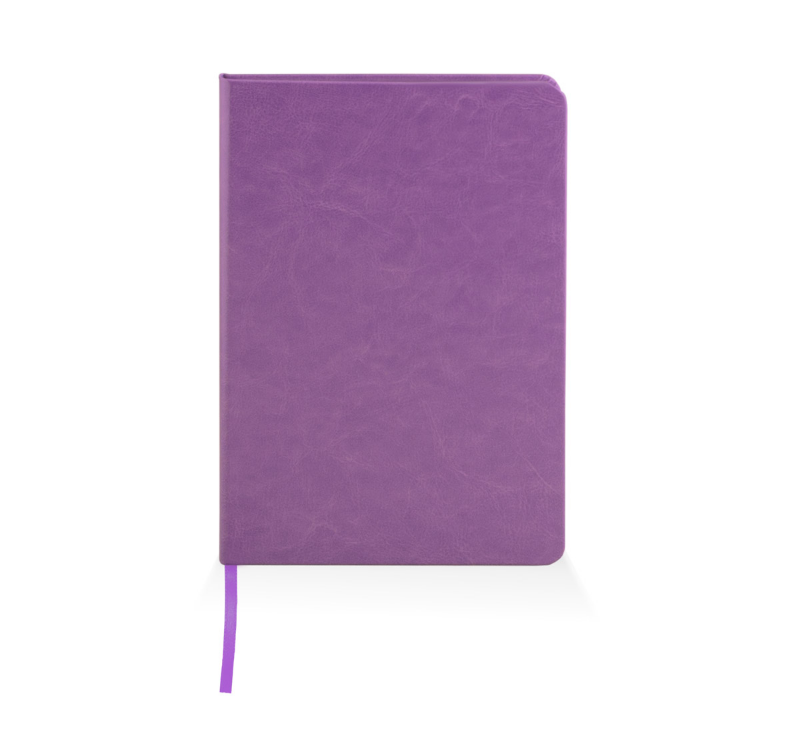 Бележник размер А5 с твърди корици от рециклирана еко кожа със 160 страници на редове от рециклирана хартия. С отметка в съответстващ цвят и ластик.