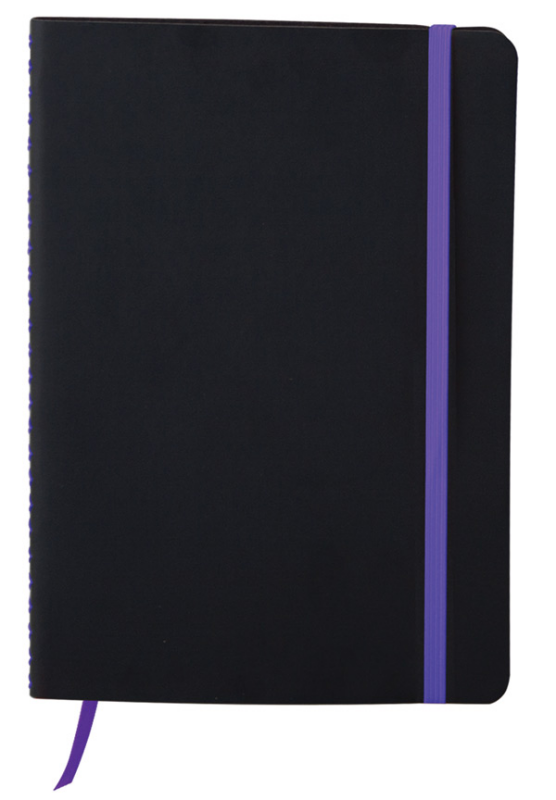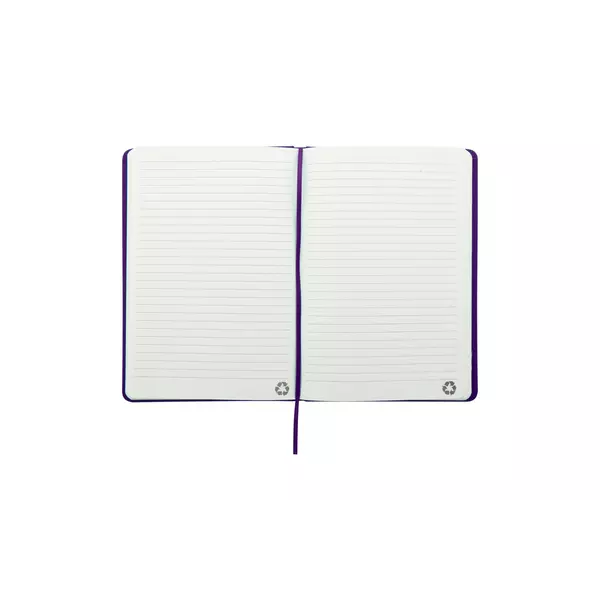 Бележник размер А5 с твърди корици от рециклирана еко кожа със 160 страници на редове от рециклирана хартия. С отметка в съответстващ цвят и ластик.