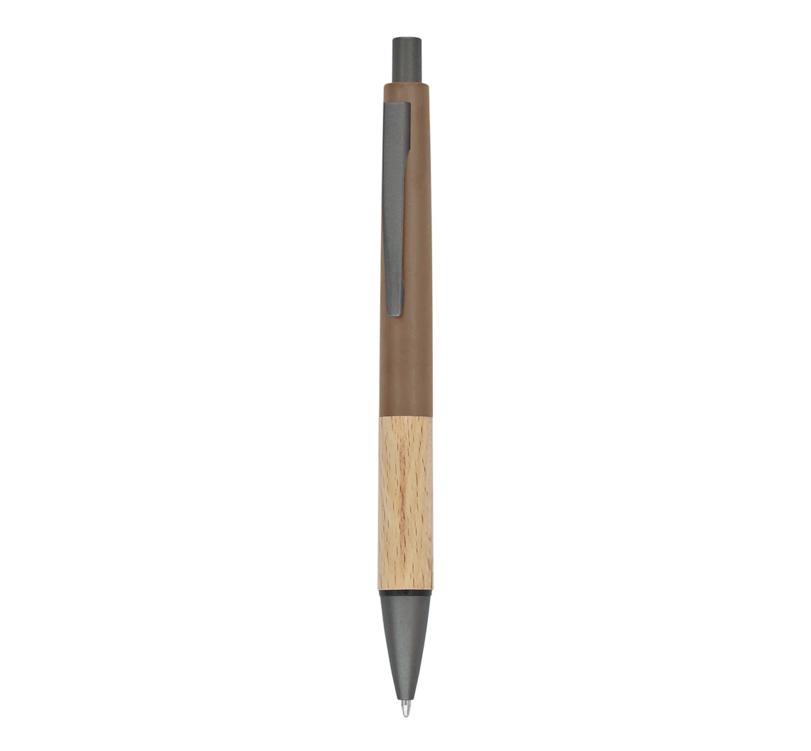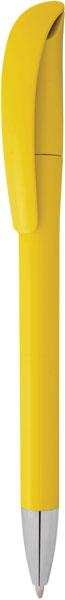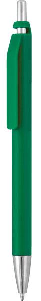 Пластмасова рекламна химикалка с гумиран цветен корпус, натискащ се механизъм и син пълнител.