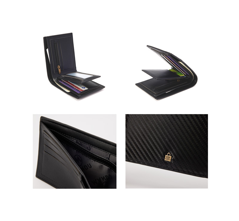 Портфейл с RFID защита, две отделения за банкноти, вътрешни джобове за карти.