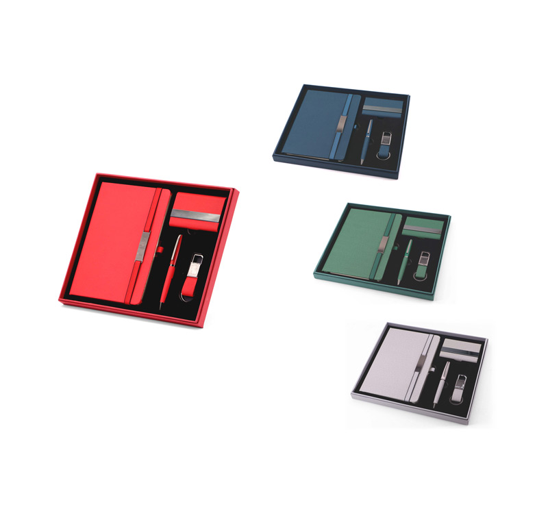 Комплект тефтер, химикалка, ключодържател и визитник в кутия.