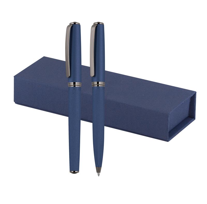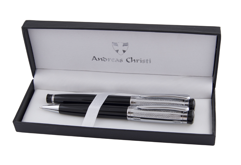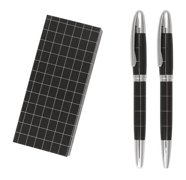 Елегантния комплект от черни химикалка и ролер е перфектна комбинация от модерен дизайн и практичност. Отличават се с гладко, матово черно тяло в горната част и фино набраздена долна част, което допринася за по-удобно захващане. Техните металик акценти им придават изискан и професионален вид. В красива подаръчна кутия.