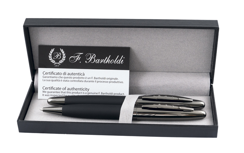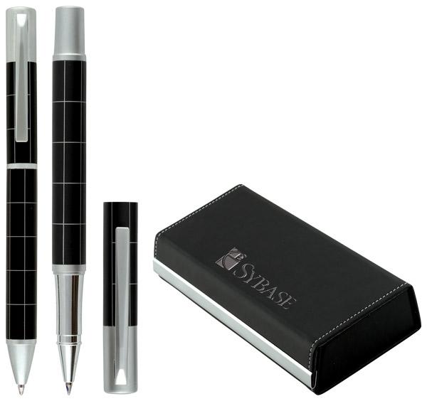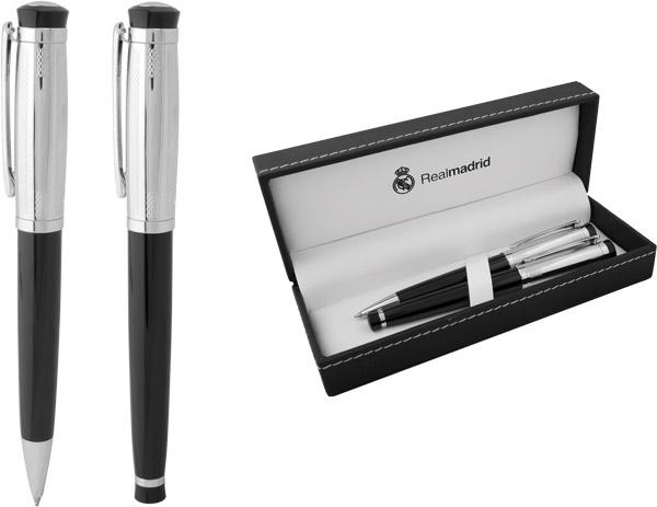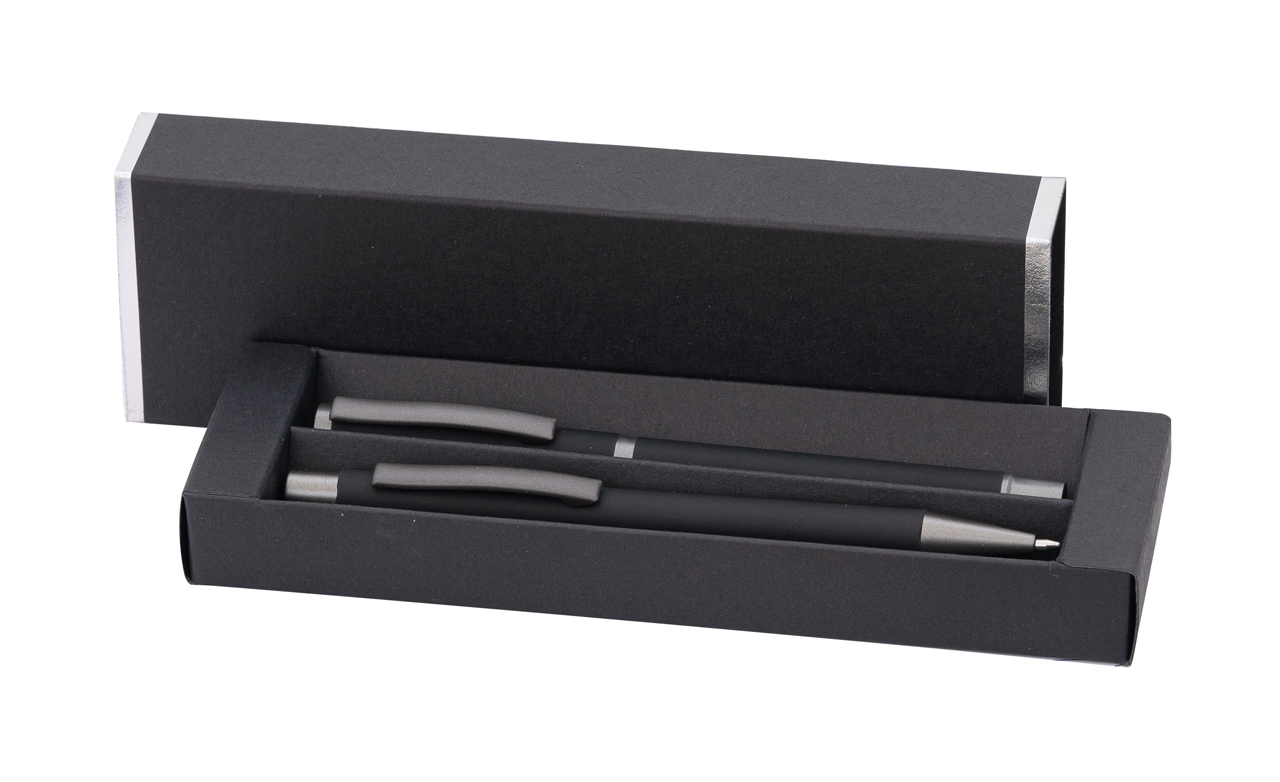 Елегантния комплект от черни химикалка и ролер е перфектна комбинация от модерен дизайн и практичност. Отличават се с гладко, матово черно тяло в горната част и фино набраздена долна част, което допринася за по-удобно захващане. Техните металик акценти им придават изискан и професионален вид. В красива подаръчна кутия.