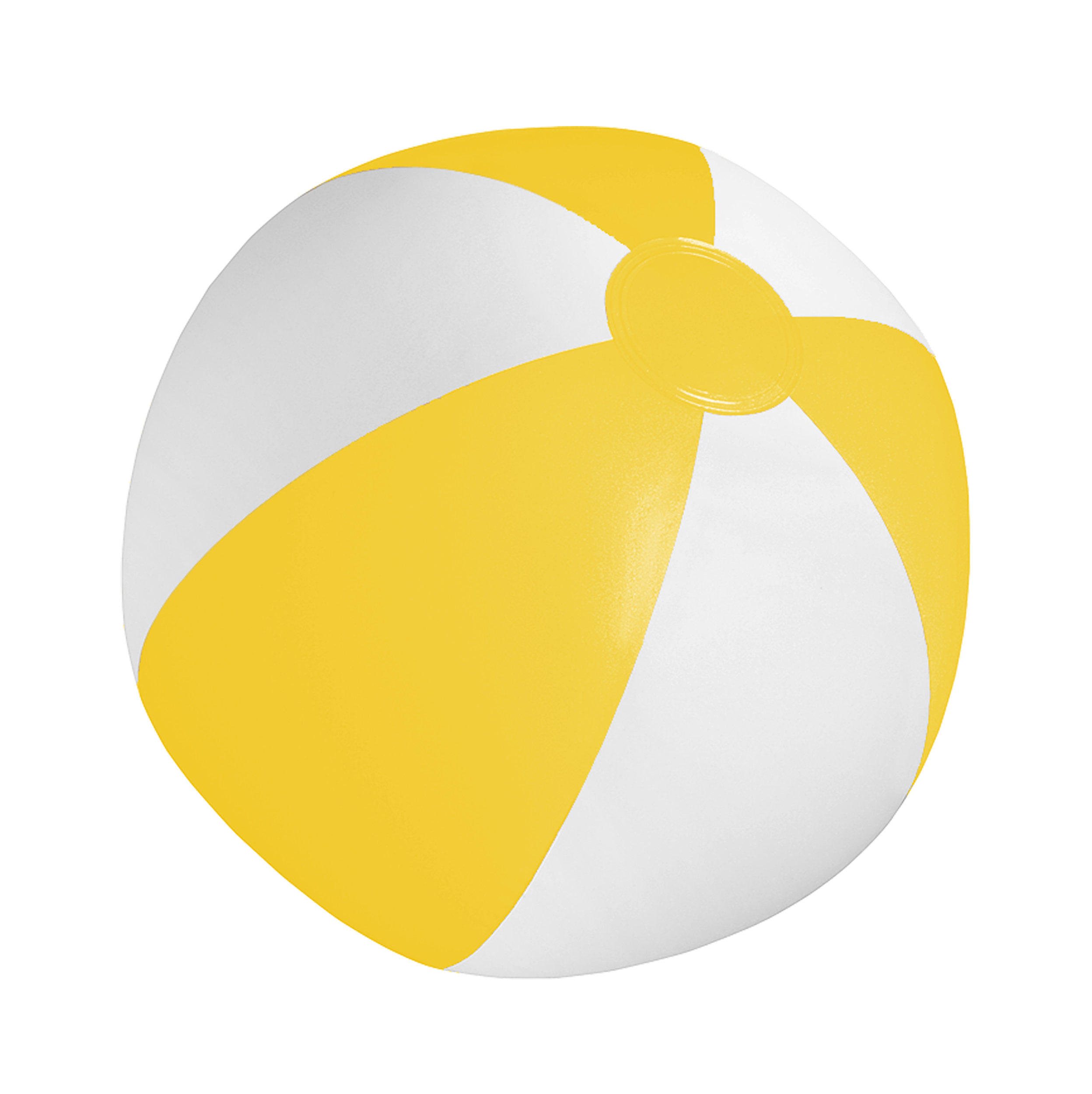 Надуваема рекламна плажна топка Playo от непрозрачна пластмаса в бяло и жълто с диаметър 28 см.