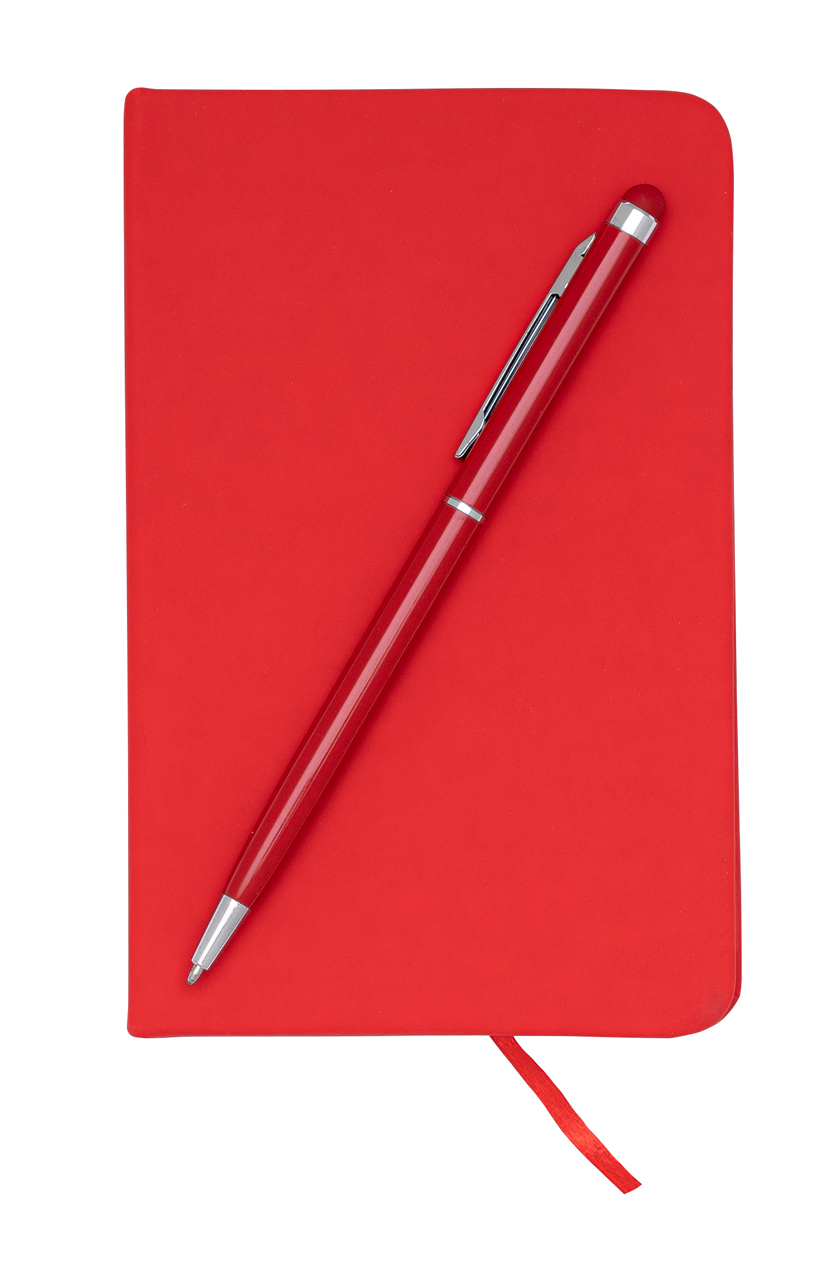 Комплект бележник A6 от рециклирана еко кожа и тънка метална химикалка в подаръчна кутия.