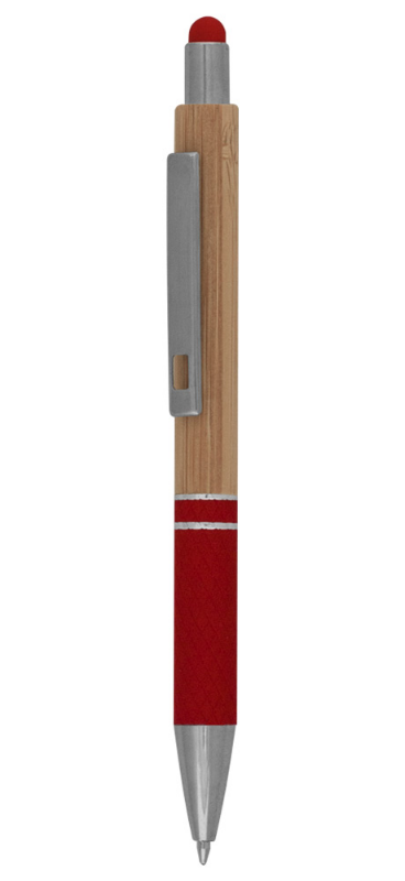 Метална химикалка с меко гумирано покритие, металик елементи, бамбукови захващане и бутон.