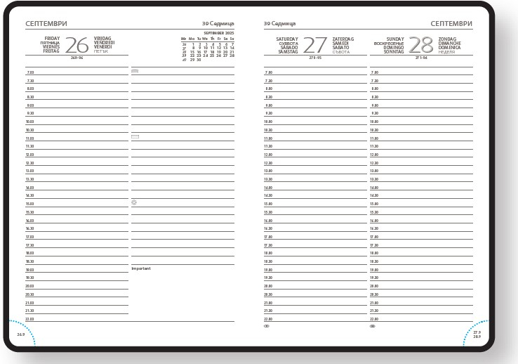 С дати. Мултинационално тяло, осем езика вкл. български, заглавна страница, официални и църковни празници в България и 24 страни. Хартия бял офсет. Текстилна лента за отбелязване. Перфорация на ъглите.