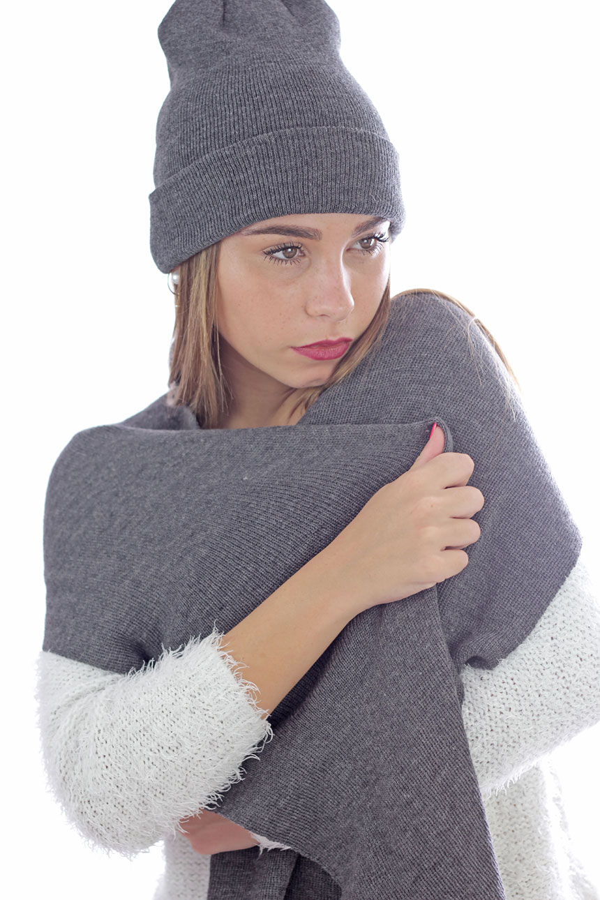 WIND SCARF с плетената си акрилна прежда е многофункционален и удобен шал, перфектен с подходящата зимна шапка.