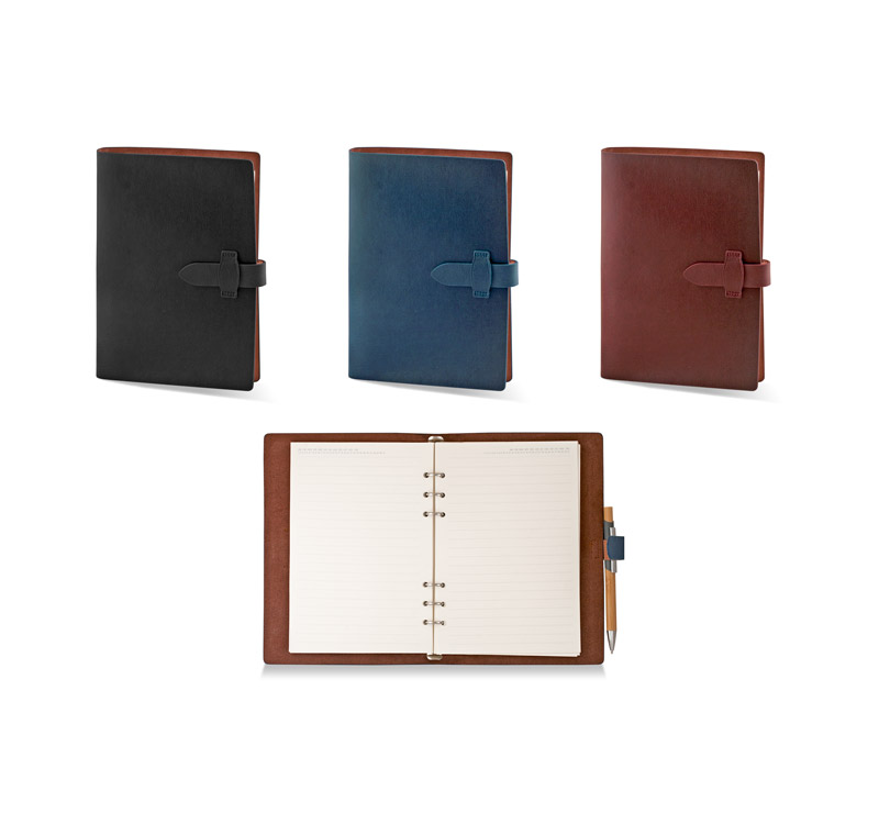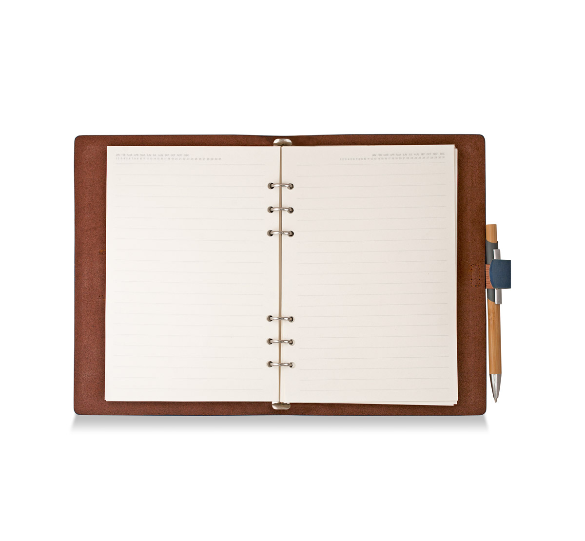 Тефтер от естествена кожа, място за химикалка, 85 листа с редове, 10 листа с малки квадратчета и 10 листа без редове, цвят на хартията слонова кост, мека корица. Материал: естествена кожа, хартия. Размер на артикула: 165х230x15 mm. Печатаемо поле: 80х40 mm. Печат: тампонен, ситопечат, гравиране, сухо преге. (В цената не е включена химикалката!)