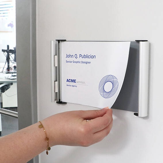 Табели за офис врати OSLO с алуминиев профил и снап закопчаващ механизъм за бърза смяна на съдържанието. В комплекта са включени скрепители и двустранно лепилна лента.