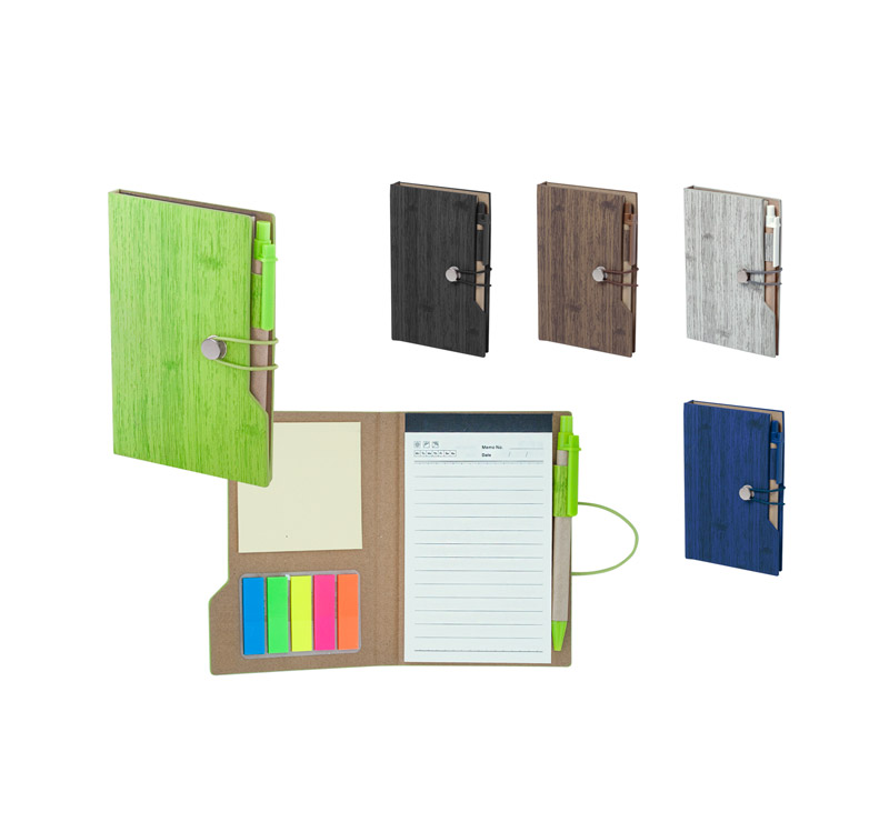 Тефтер A6 с еко химикалка, 70 листа с редове, цвят на хартията слонова кост, твърда корица, самозалепващи листчета.