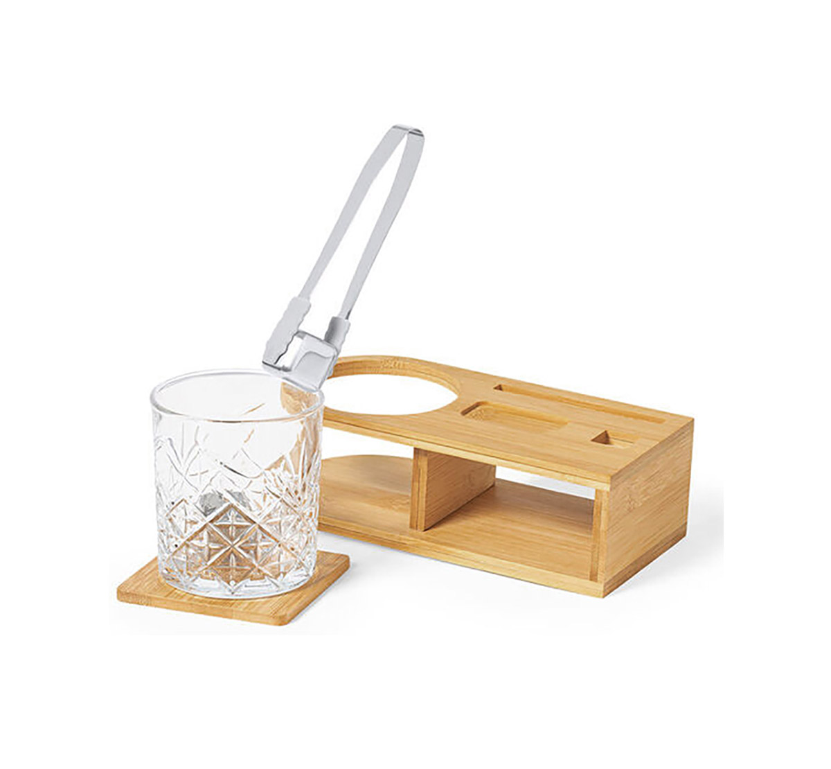 Комплект за уиски: чаша (300 ml), 2 стоманени охлаждащи кубчета за многократна употреба, щипка от неръждаема стомана, подложка за чаша.