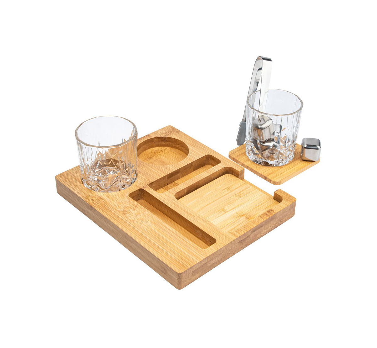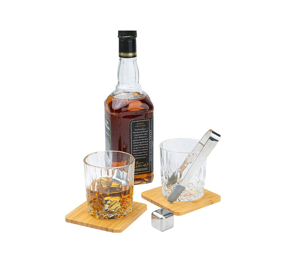 Комплект за уиски: 2 чаши (300 ml), 4 стоманени охлаждащи кубчета за многократна употреба, щипка от неръждаема стомана, 2 подложки за чаши.