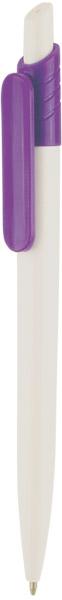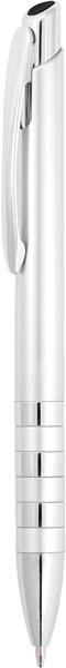 Пластмасова рекламна химикалка с гумиран цветен корпус, натискащ се механизъм и син пълнител.