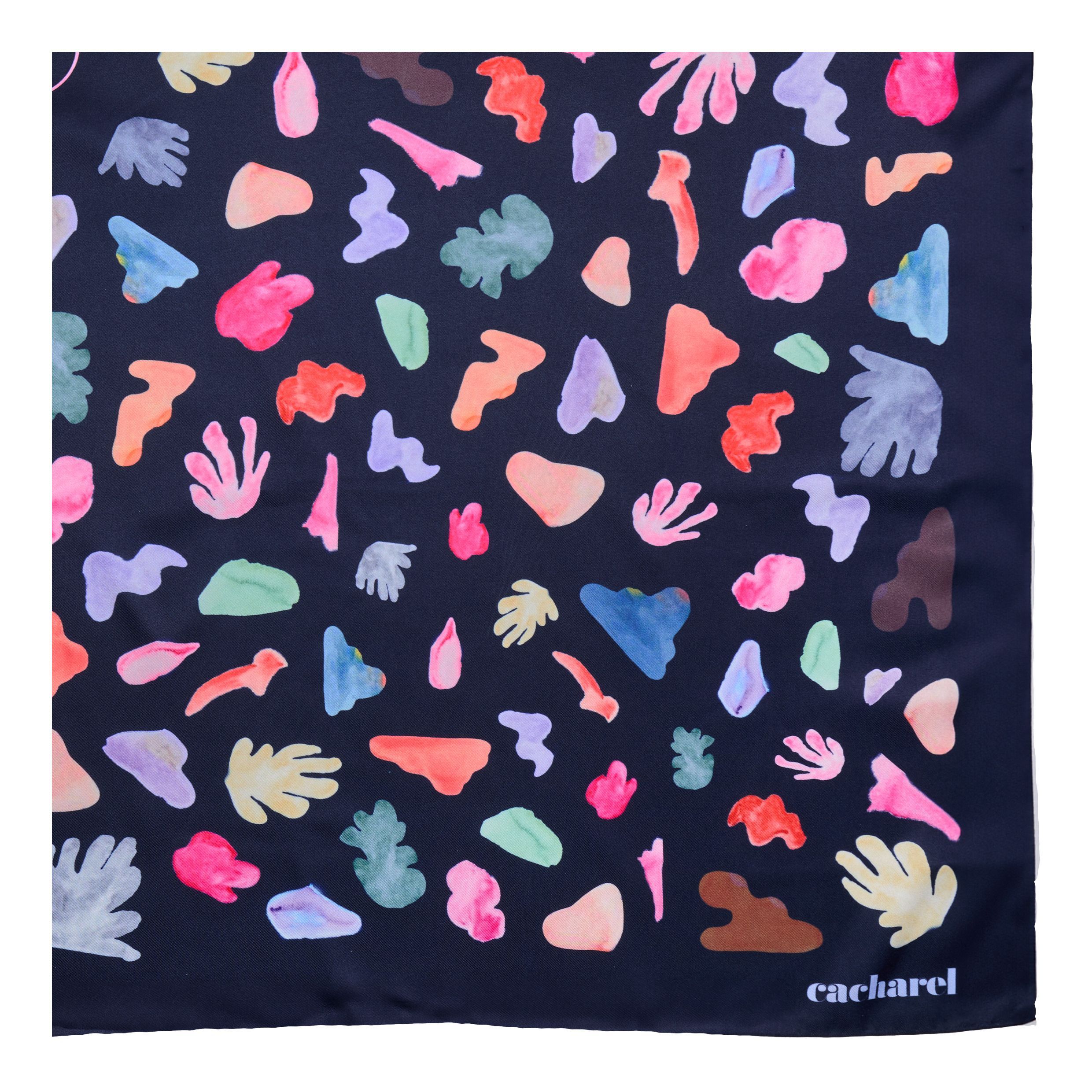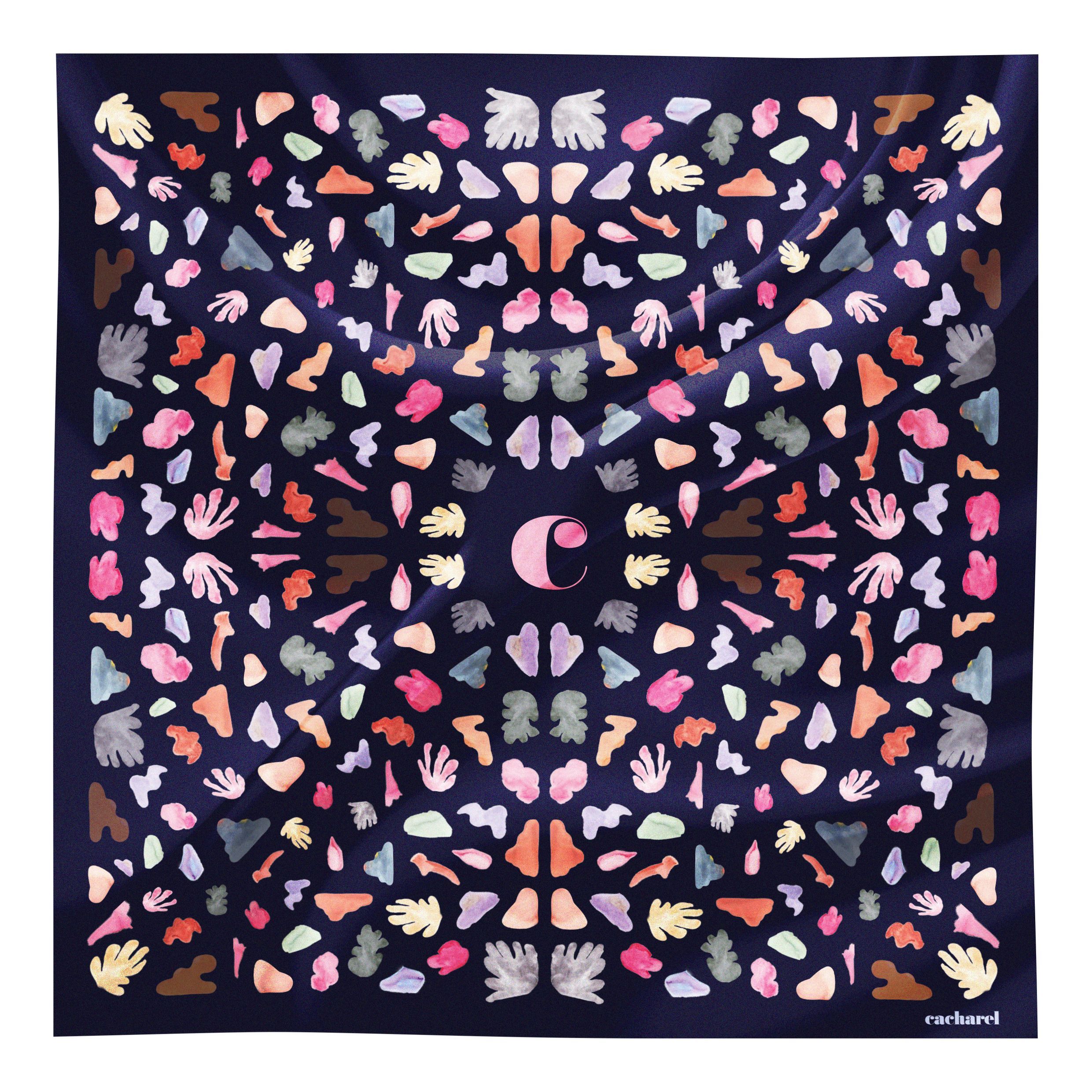 Шал Apolline в тъмносиньо съчетава меки цветни тонове и органични форми, вдъхновени от естествените движения в природата. Акварелният мотив внася усещане за свежест и елегантност към всеки тоалет.