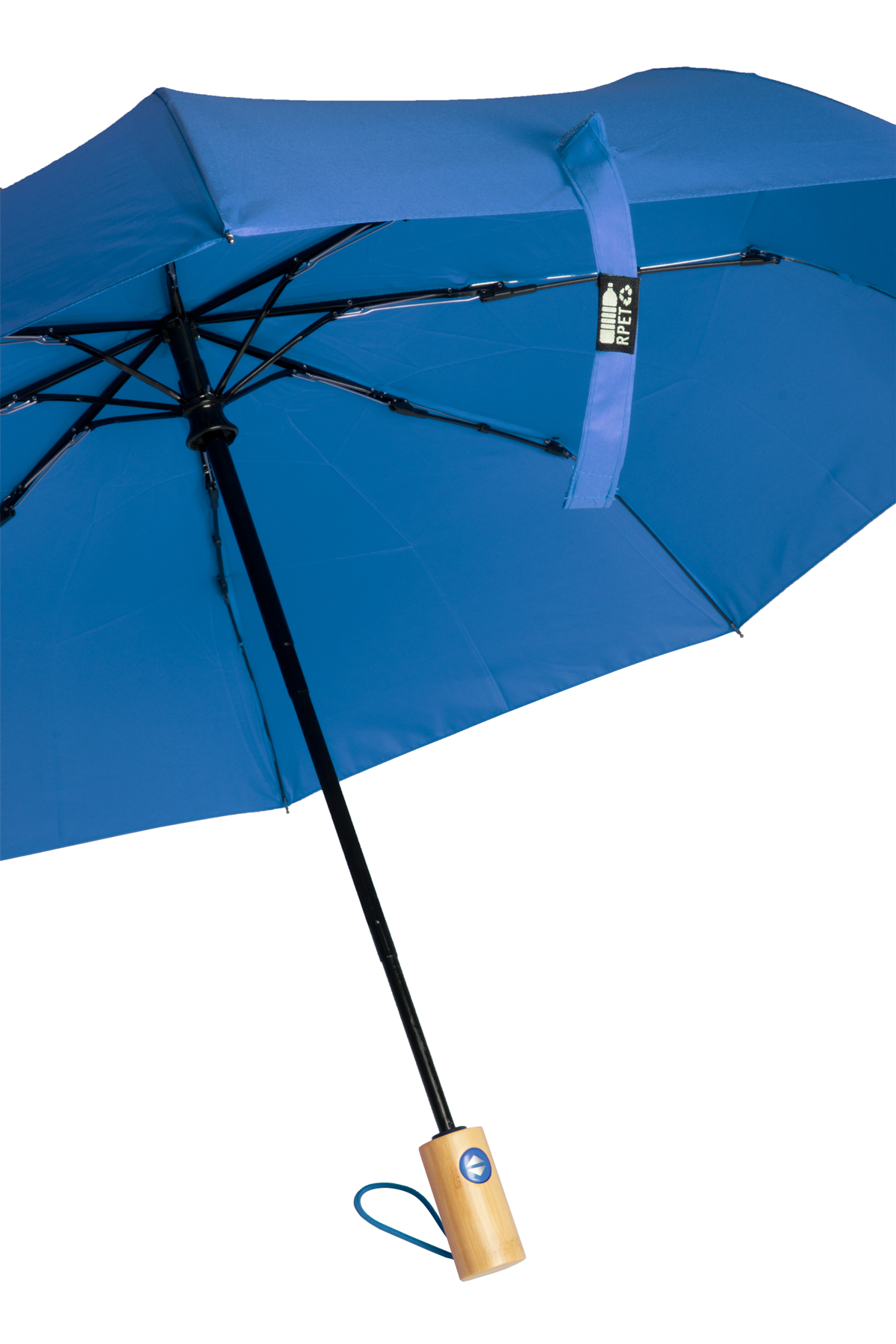 Напълно автоматичен (отваряне/затваряне), ветроустойчив сгъваем чадър RPET с 8 панела в калъфче в съвпадащ цвят. С метална рамка, ребра от фибростъкло и бамбукова дръжка.
