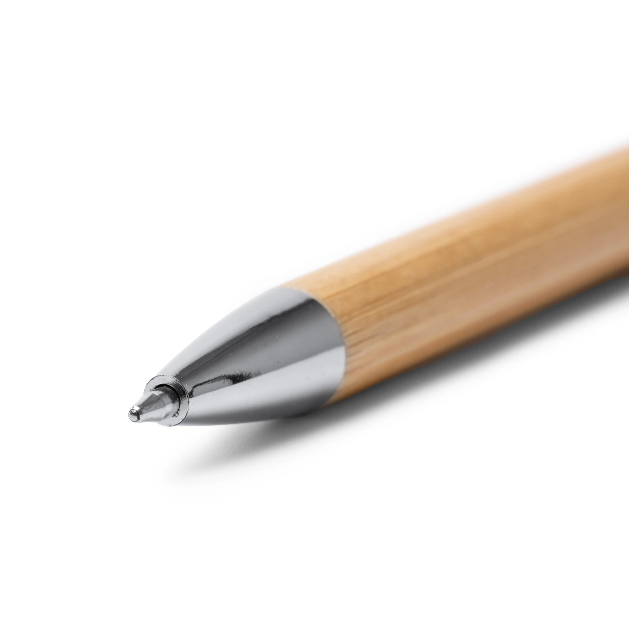 Химикалка, изработена от бамбук, с метален клипс и хромирани елементи. Със син пълнител.