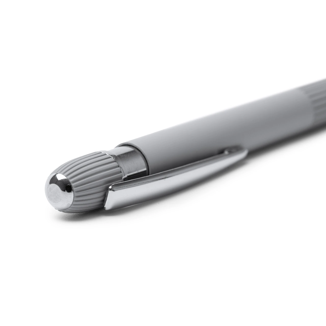 Химикалка от рециклиран алуминий с набраздена повърхност за лесен захват, матово гумено покритие и хромирани елементи.