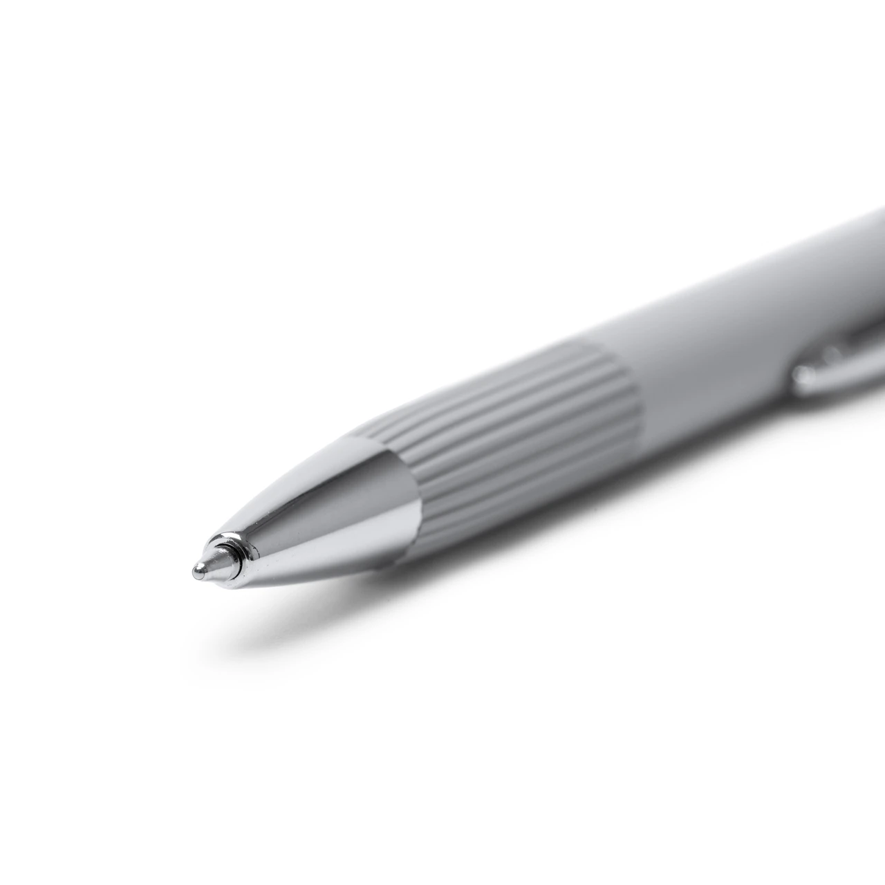 Химикалка от рециклиран алуминий с набраздена повърхност за лесен захват, матово гумено покритие и хромирани елементи.