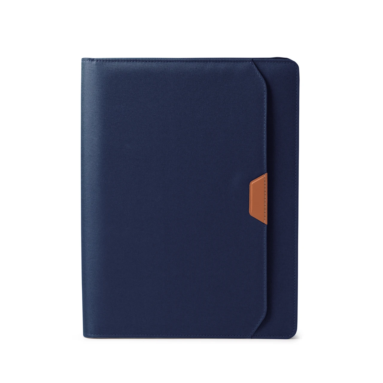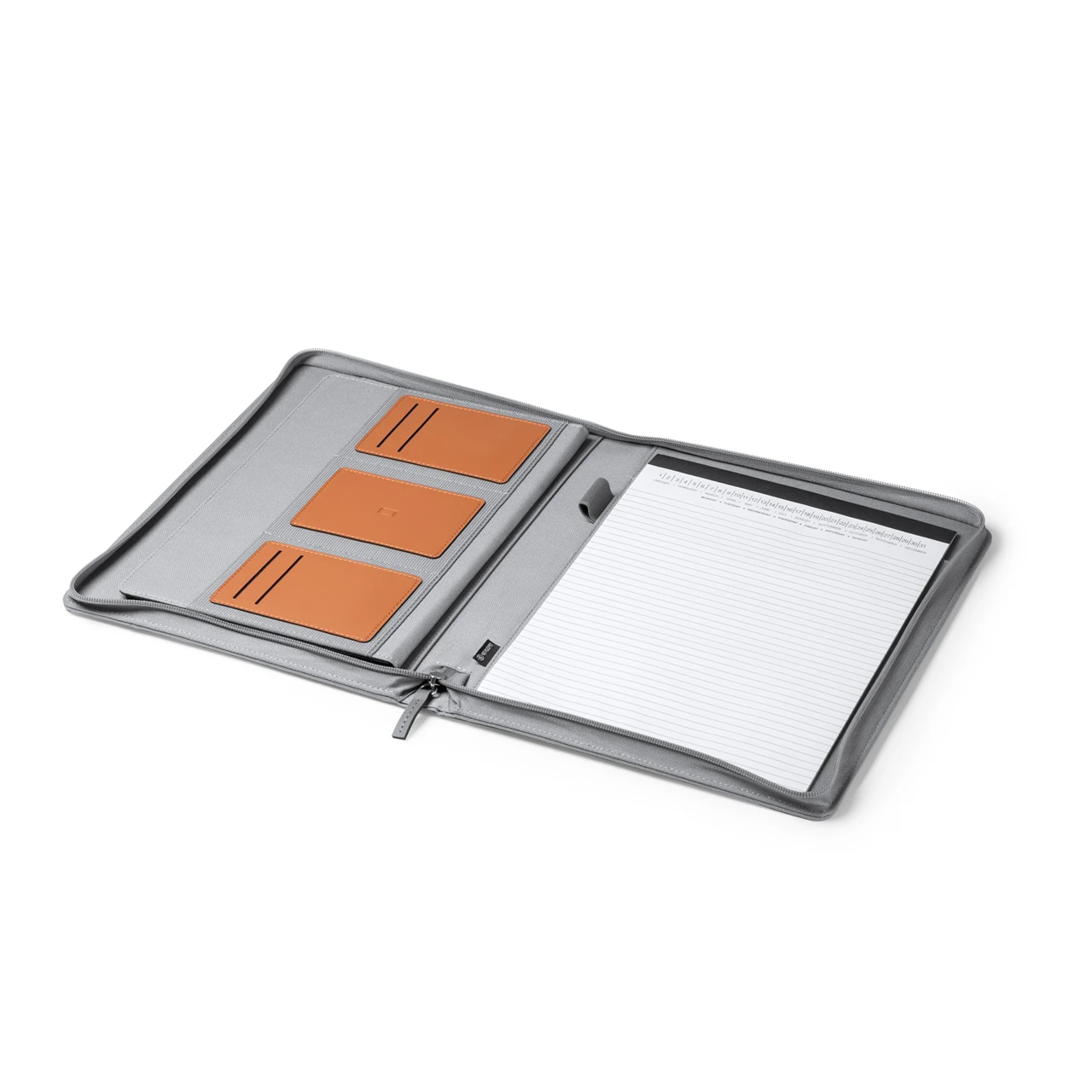 Многофункционална папка формат A4 от RPET и еко кожа с цип. Разполага с външен джоб, вътрешни отделения и място за 4 карти. Включва държач за химикалка и подменяем бележник с 20 редови листа.