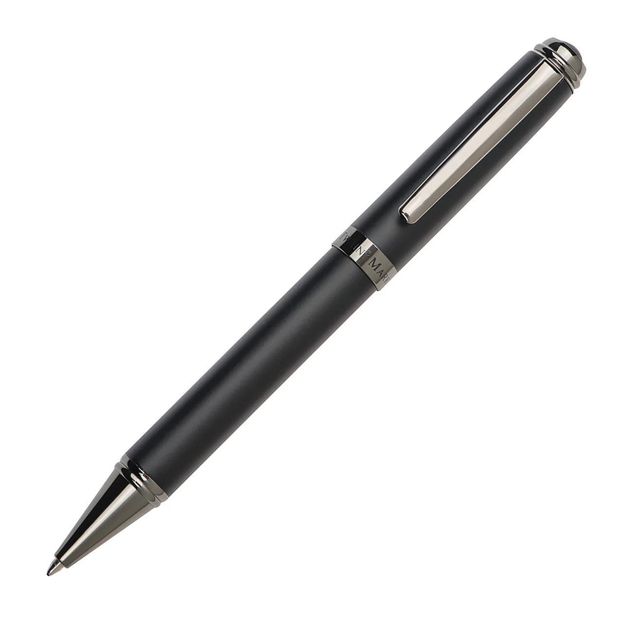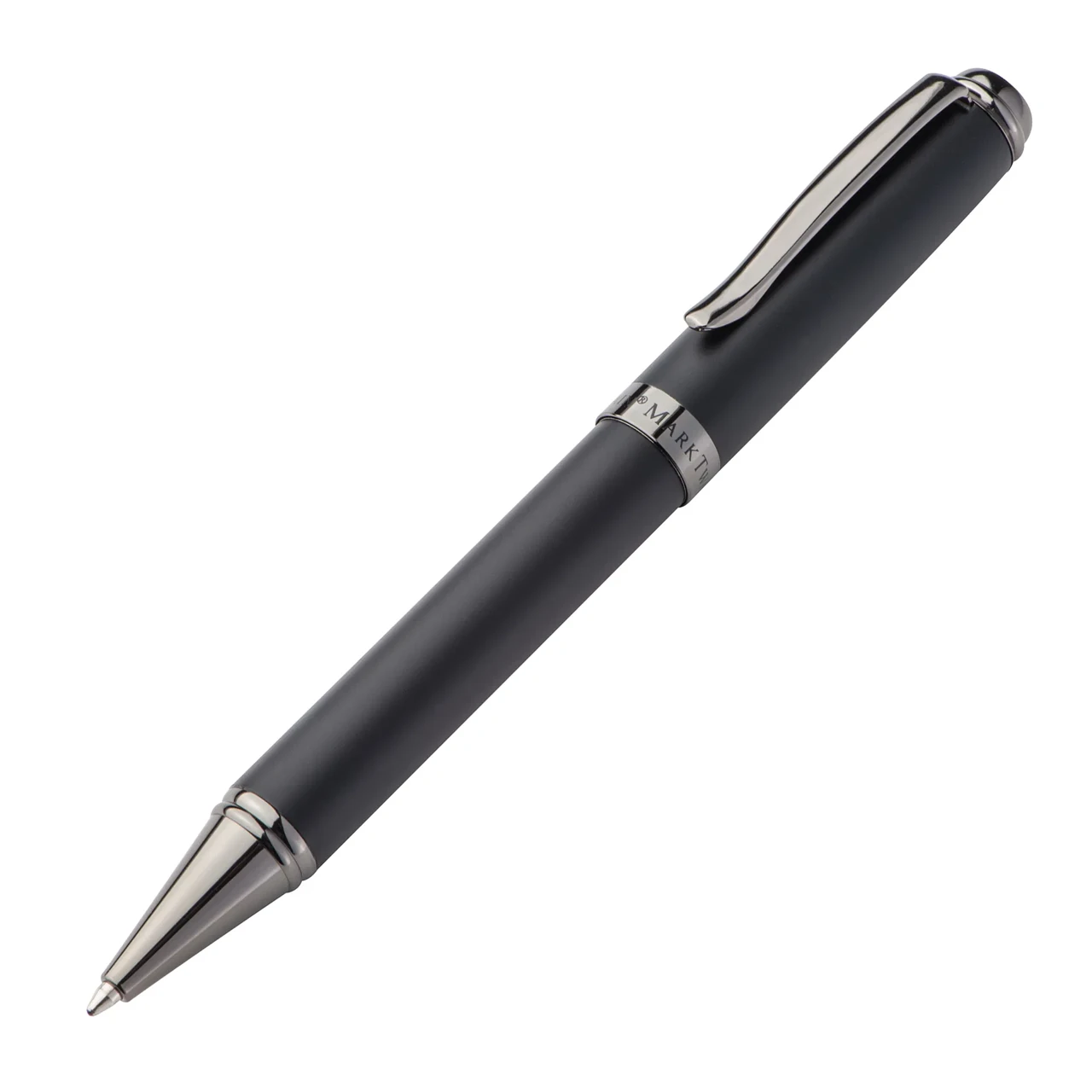Металната химикалка Mark Twain предлага елегантен и класически дизайн, изработена от висококачествен метал с тъмно хромирани акценти, които създават привлекателен контраст. Гумираното покритие осигурява приятен захват и усещане при писане. Поставя се в стилна кутия, което я прави подходящ подарък за бизнес партньори, клиенти или служители.