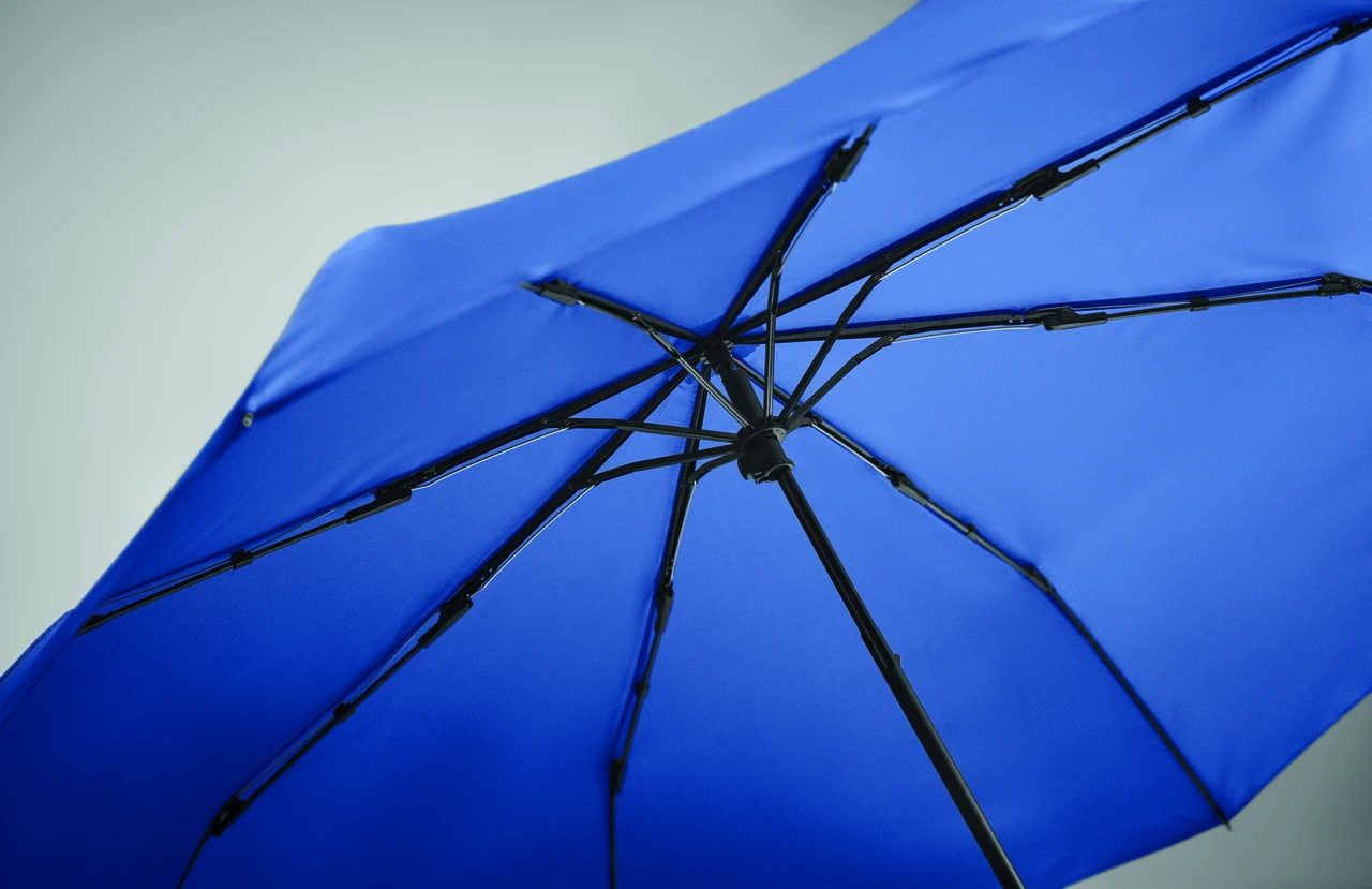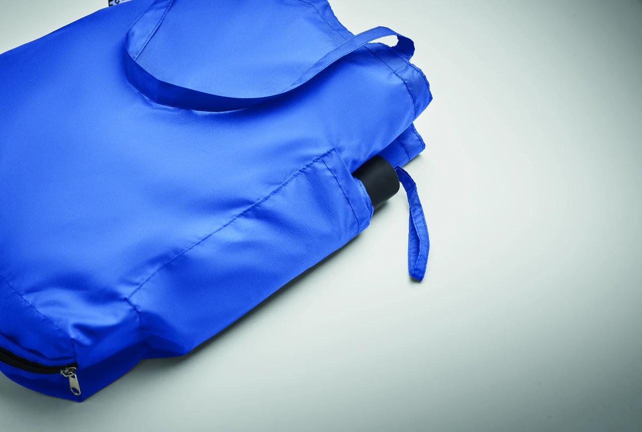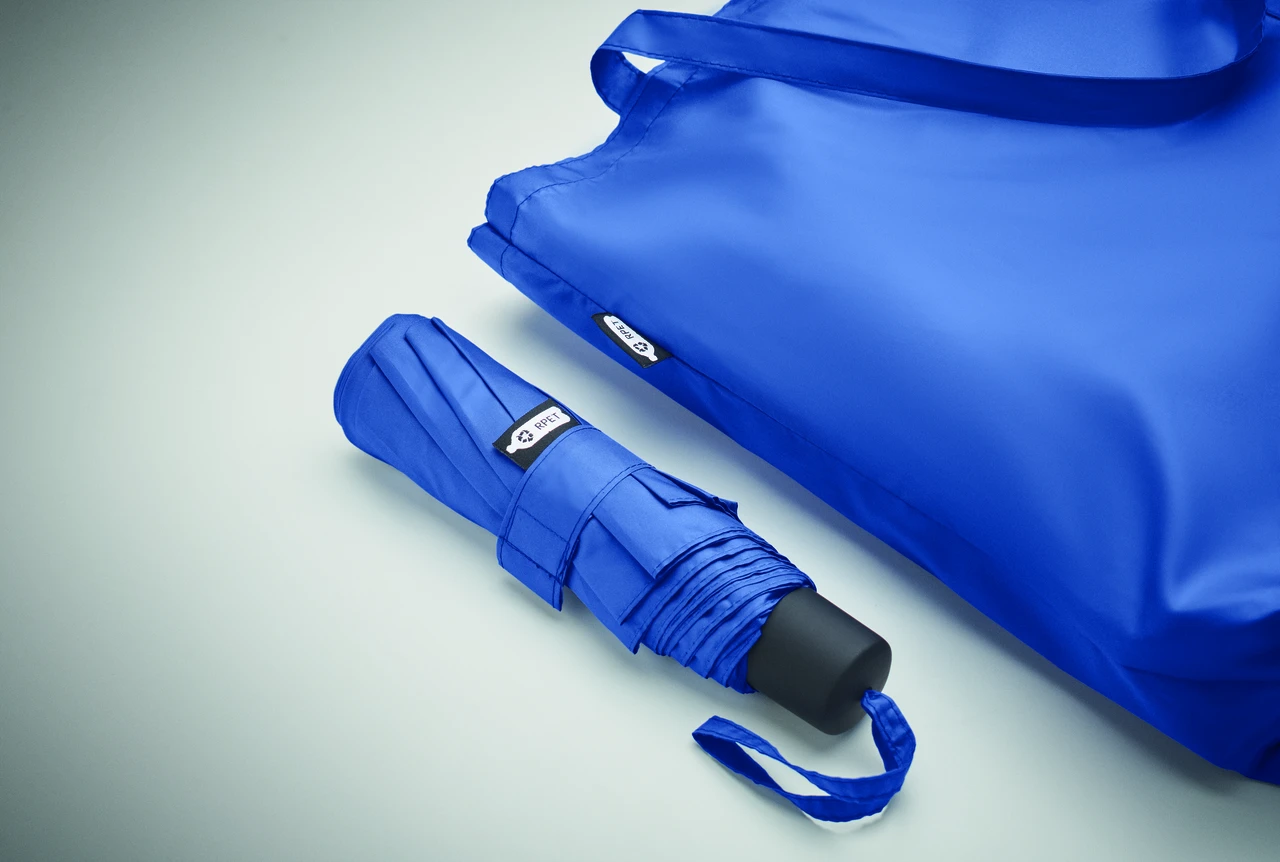 Комплект ветроустойчив сгъваем чадър и чанта от 190T RPET понджи. Чадърът е с ръчно отваряне и затваряне. Включената чанта има скрито отделение с цип за съхранение на мокрия чадър, който предпазва останалите вещи от влага. Когато не се използва, торбичката се свива и функционира като калъф за чадъра.