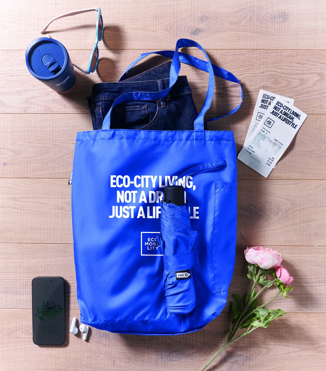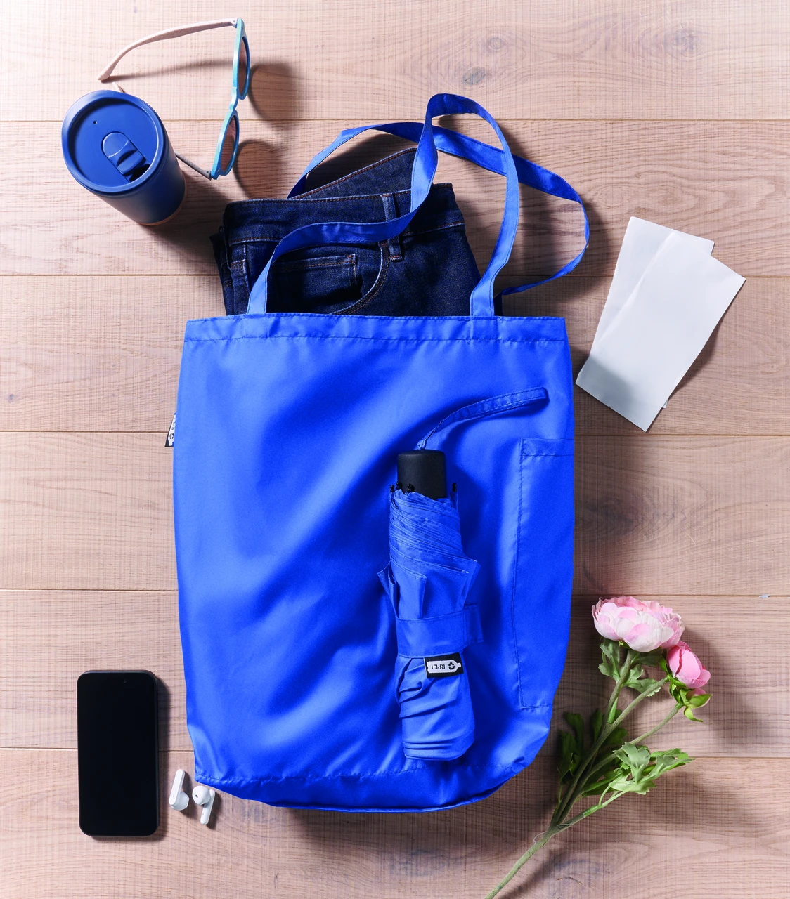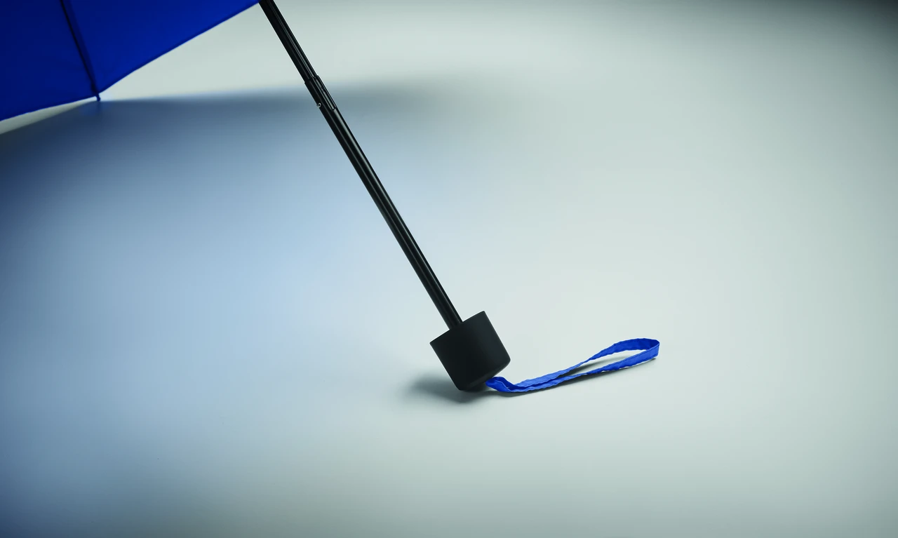 Комплект ветроустойчив сгъваем чадър и чанта от 190T RPET понджи. Чадърът е с ръчно отваряне и затваряне. Включената чанта има скрито отделение с цип за съхранение на мокрия чадър, който предпазва останалите вещи от влага. Когато не се използва, торбичката се свива и функционира като калъф за чадъра.