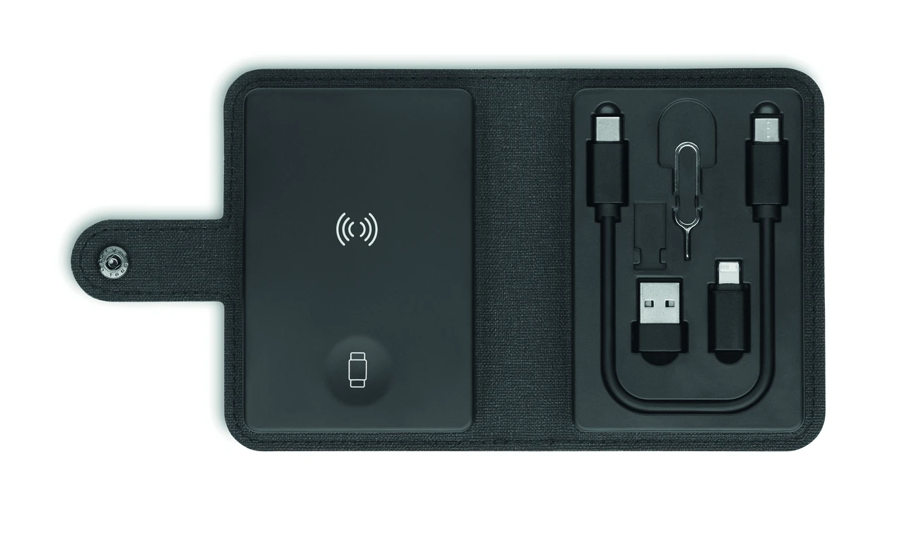 Универсален комплект за зареждане, изработен от рециклирани PU, RPET, ABS и алуминий. Включени са: безжично зарядно устройство 15W, зарядно за часовник (само за Apple Watch), 4-в-1 кабел за зареждане, инструмент за изваждане на SIM карта.