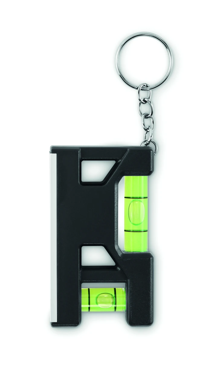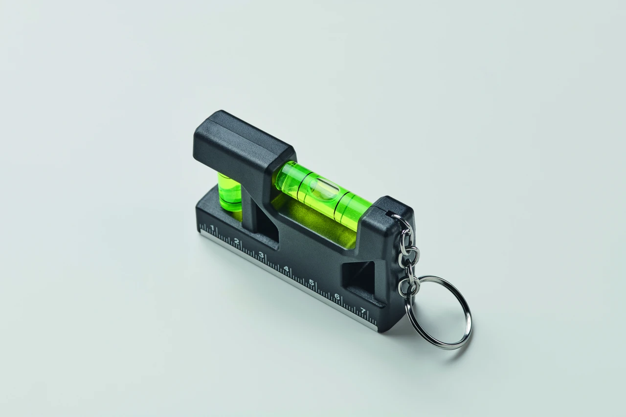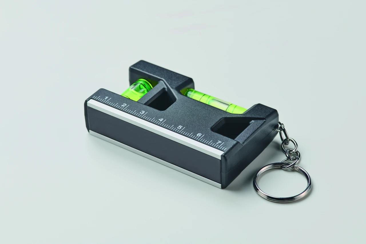 Ключодържател от рециклирана ABS пластмаса. Вградена линийка, магнит и два нивелира с мехурче.