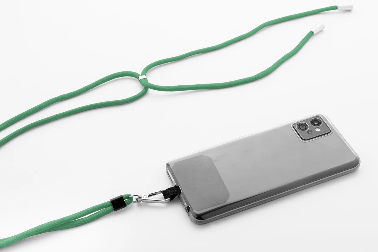 Лента с регулируема дължина от рециклиран PET с метален карабинер и вложка за закачане на телефон.
