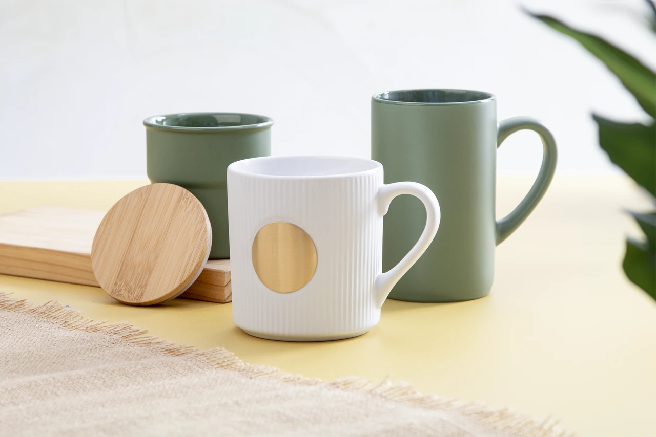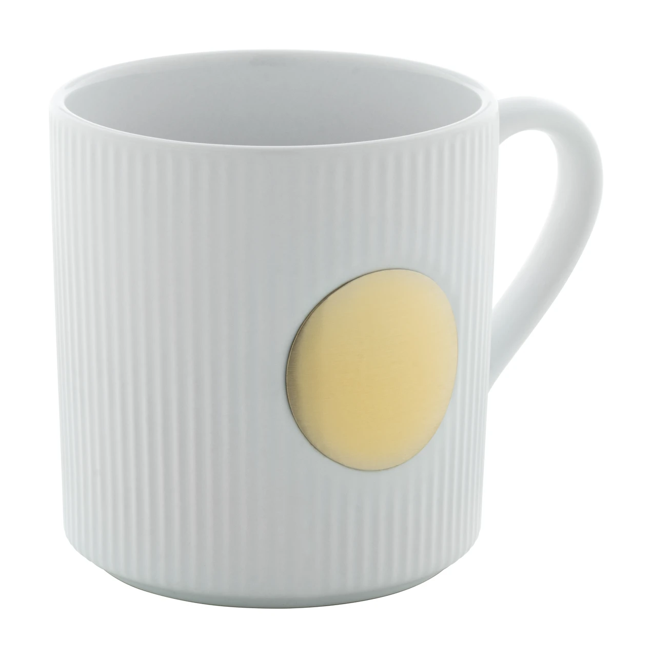 Висококачествена керамична чаша с месингова плоча за гравиране. Матова външна и гланцова вътрешна повърхност. Опаковка: кутия от kraft хартия. Капацитет: 330 ml.