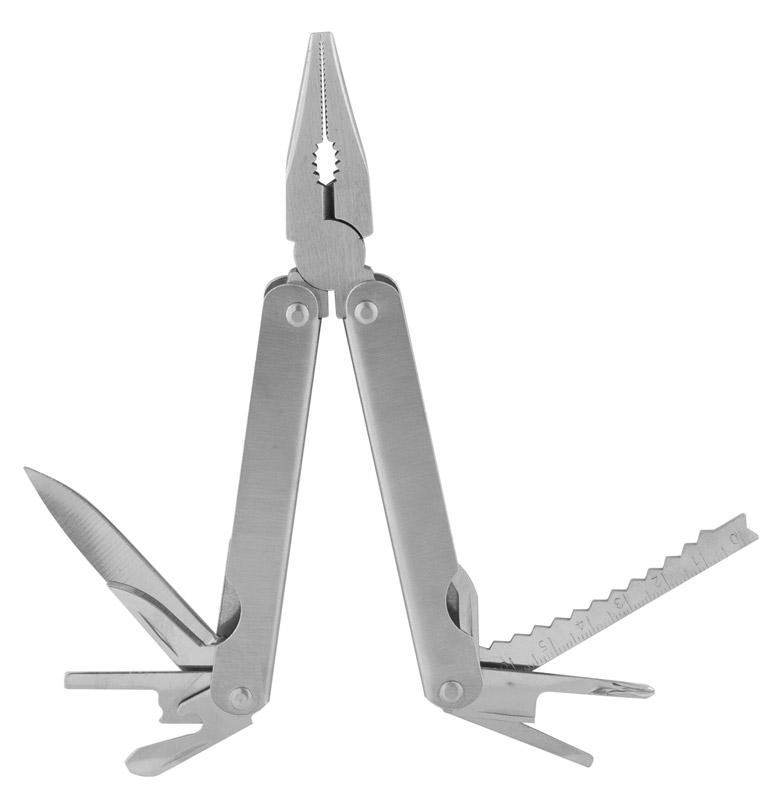 Мултифункционален джобен нож от неръждаема стомана с бамбукова дръжка и връзка от еко кожа. 9 функции: нож, отварачка за консерви и бутилки, тирбушон, отвертка, пила, ножици и др.