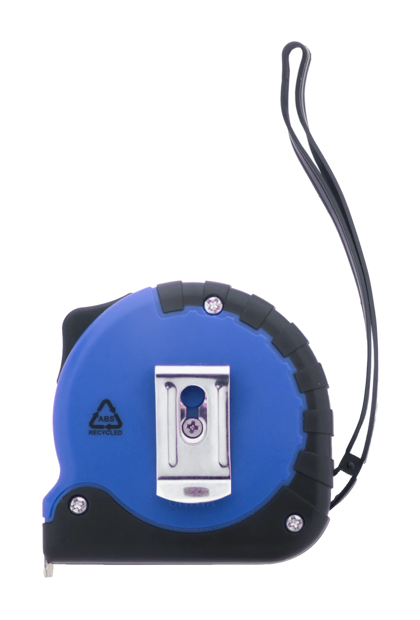 Ролетка от рециклирана ABS пластмаса с функция за застопоряване, метален клипс и каишка. Дължина: 5m.