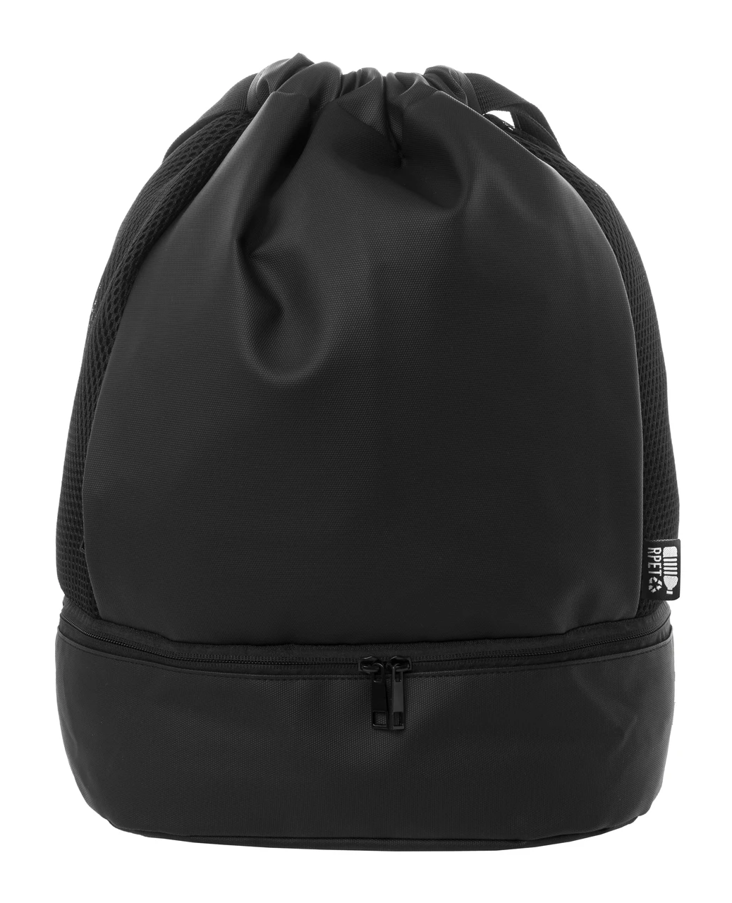 Мешка от рециклиран полиестер (RPET 600D) с покритие от еко кожа. Има отделение за обувки с цип и широки презрамки.