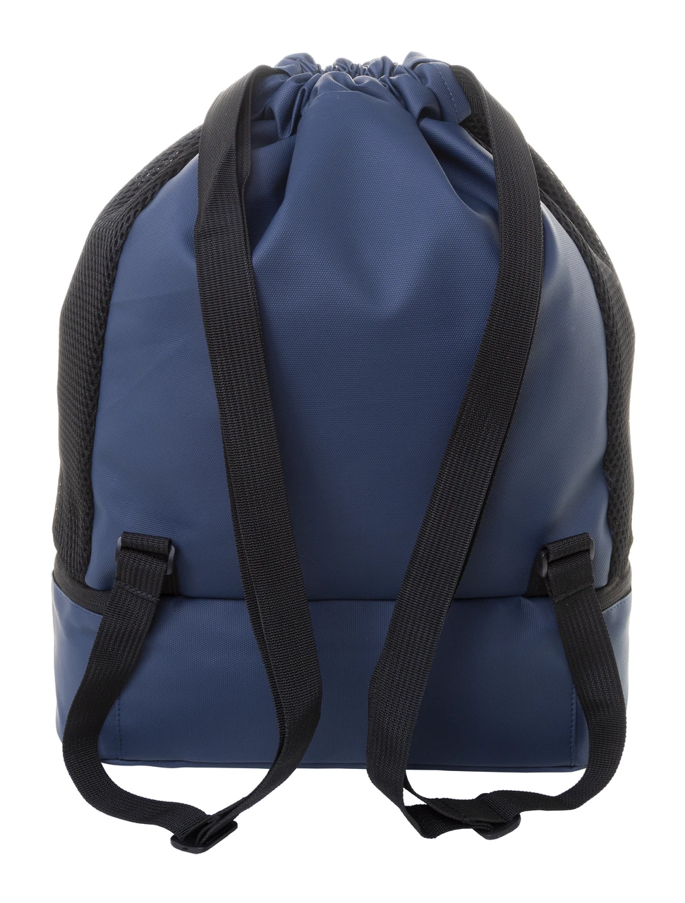 Мешка от рециклиран полиестер (RPET 600D) с покритие от еко кожа. Има отделение за обувки с цип и широки презрамки.