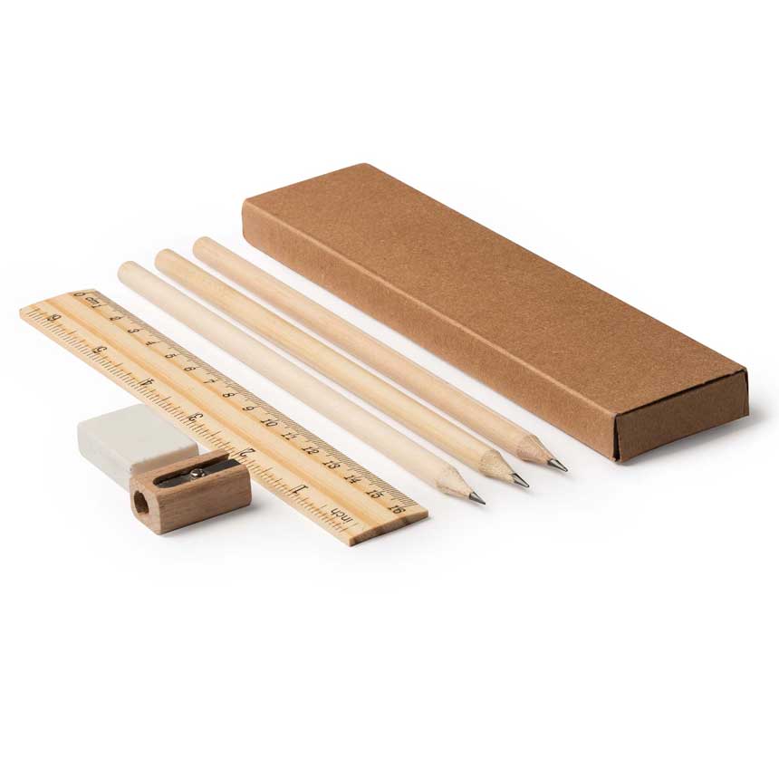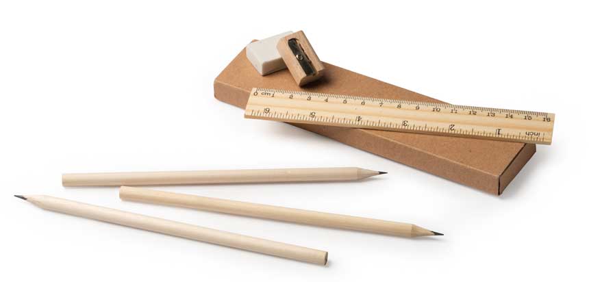 Комплект за писане от естествено дърво, представен в картонена кутия. Включени линийка, 3 молива, 1 гума и 1 острилка.
