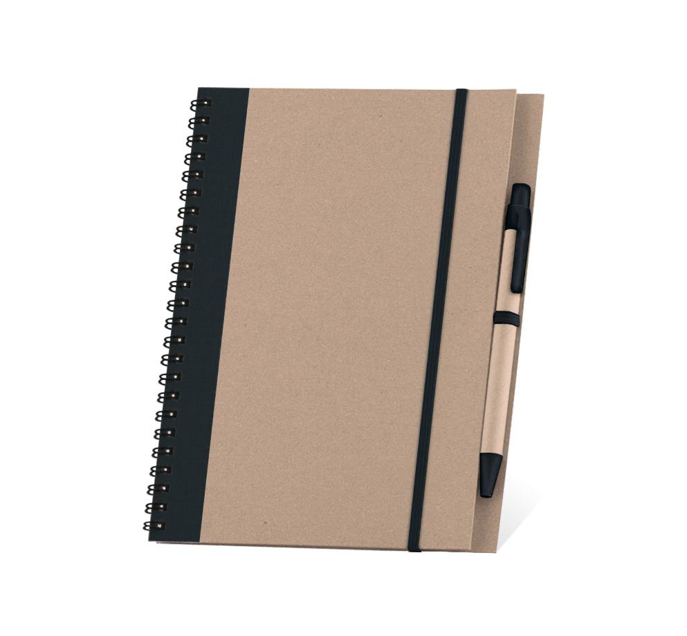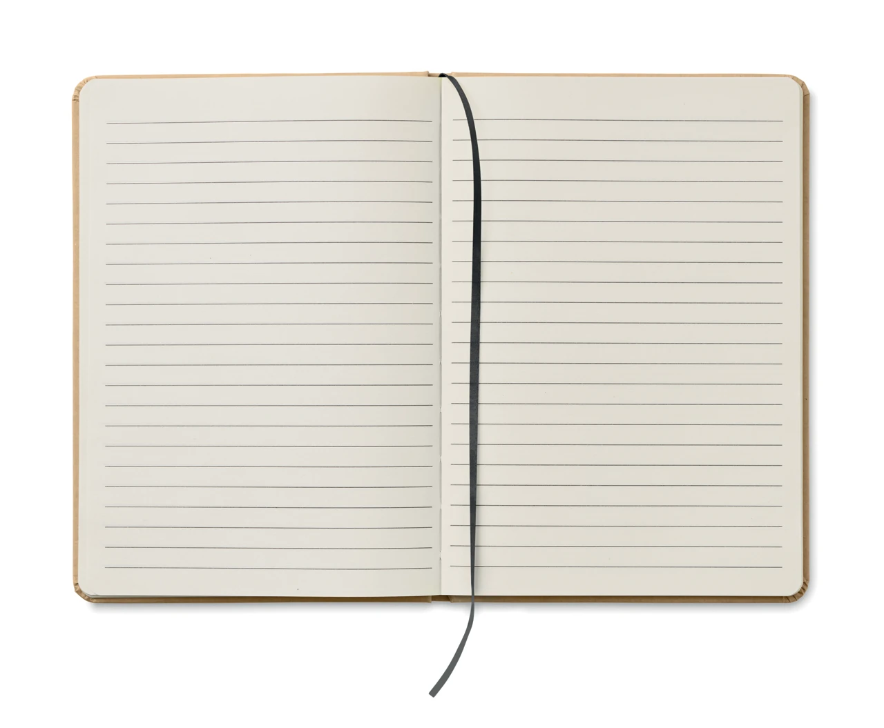 Екологичен бележник A5 с твърда корица от рециклиран картон. Съдържа 160 страници (80 листа) с редове, изработени от рециклирана хартия. Включва еластична лента за затваряне и маркираща лента. Перфектен за ежедневни бележки, идеи и записки.
