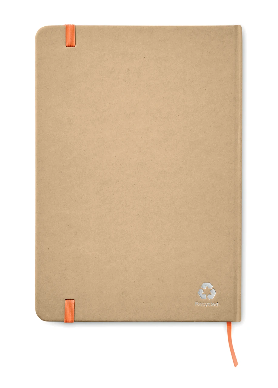 Екологичен бележник A5 с твърда корица от рециклиран картон. Съдържа 160 страници (80 листа) с редове, изработени от рециклирана хартия. Включва еластична лента за затваряне и маркираща лента. Перфектен за ежедневни бележки, идеи и записки.