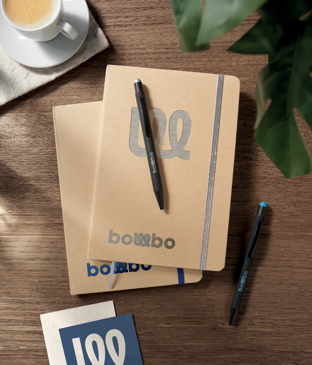Екологичен бележник A5 с твърда корица от рециклиран картон (бежов цвят). Съдържа 160 страници (80 листа) с редове, изработени от рециклирана хартия. Разкрива цвета си при лазерно гравиране. Включва еластична лента за затваряне и маркираща лента в съответстващия цвят.